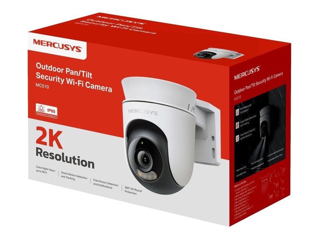 | Package Content | Vonkajšia Pan/Tilt Home Security Wi-Fi Kamera (MC510) × 1 Napájací adaptér × 1 Montážna šablóna nálepky ×1 Montážny držiak × 1 Montážne skrutky × 4 Šrouby držiaka ×2 Montážne hmoždinky × 4 Vodotesná penová podložka ×1 Rýchly sprievodca |