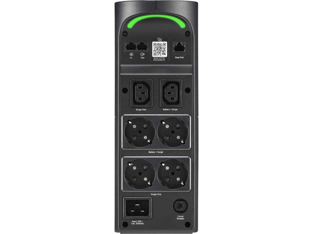 Vežová UPS 2200VA/1320W má celkovo 6 zásuviek, z čoho 3 sú záložné batérie a prepäťová ochrana a 3 sú iba prepäťovou ochranou. Má nárazovú energiu 1080 jouleov. Je vybavená automatickou reguláciou napätia, ktorá koriguje poklesy a rázy napätia na správnu úroveň. Dodáva sa s PowerChute Serial Shutdown, ľahko použiteľným softvérom pre bezpečné vypnutie systému s funkciami správy napájania a energie. Táto UPS má 3-ročnú záruku a politiku ochrany pripojeného zariadenia vo výške 150 000 USD. Má 2 USB porty (Typ A + C) pre chytré nabíjanie osobných zariadení.