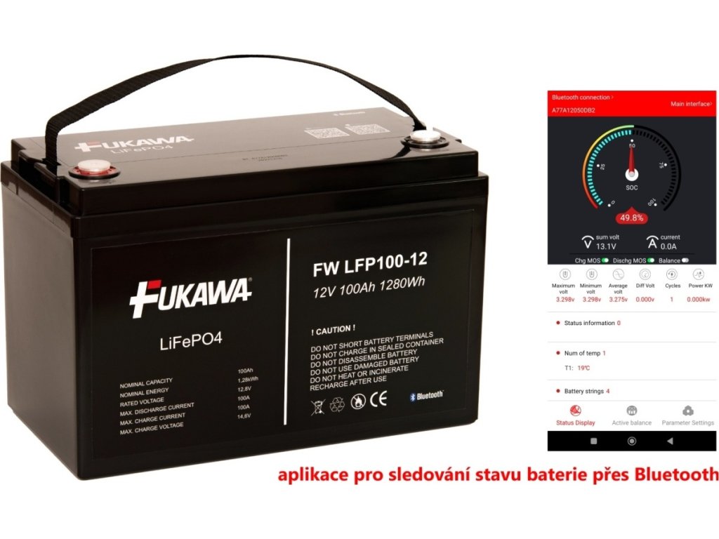 2. Bluetooth a mobilní aplikace: akumulátory FUKAWA FW LFP100-12 mají navíc integrované Bluetooth a lze tak pomocí chytrého telefonu jednoduše sledovat stav akumulátoru v reálném čase.