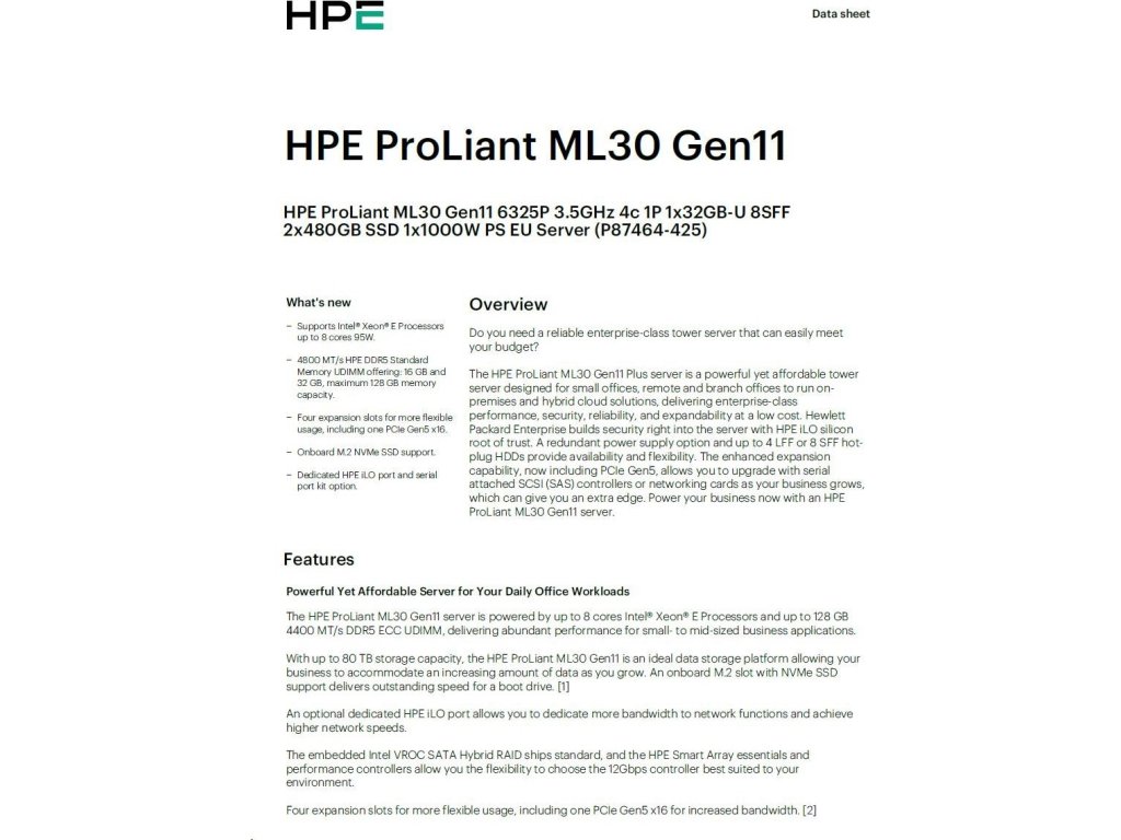 HPE PL ML30g11 6325P (3.5G/4C8T) 1x32G 2x480G SSD 8SFF VROC 1x1000W 4p1G NBD311 Smart Choice
