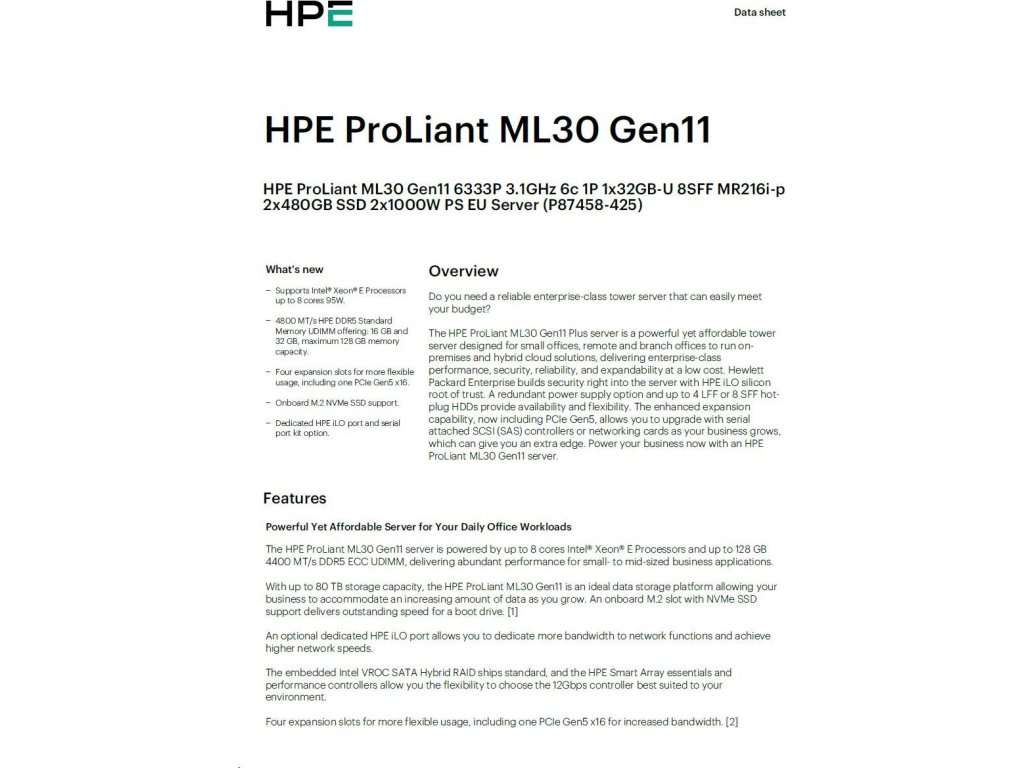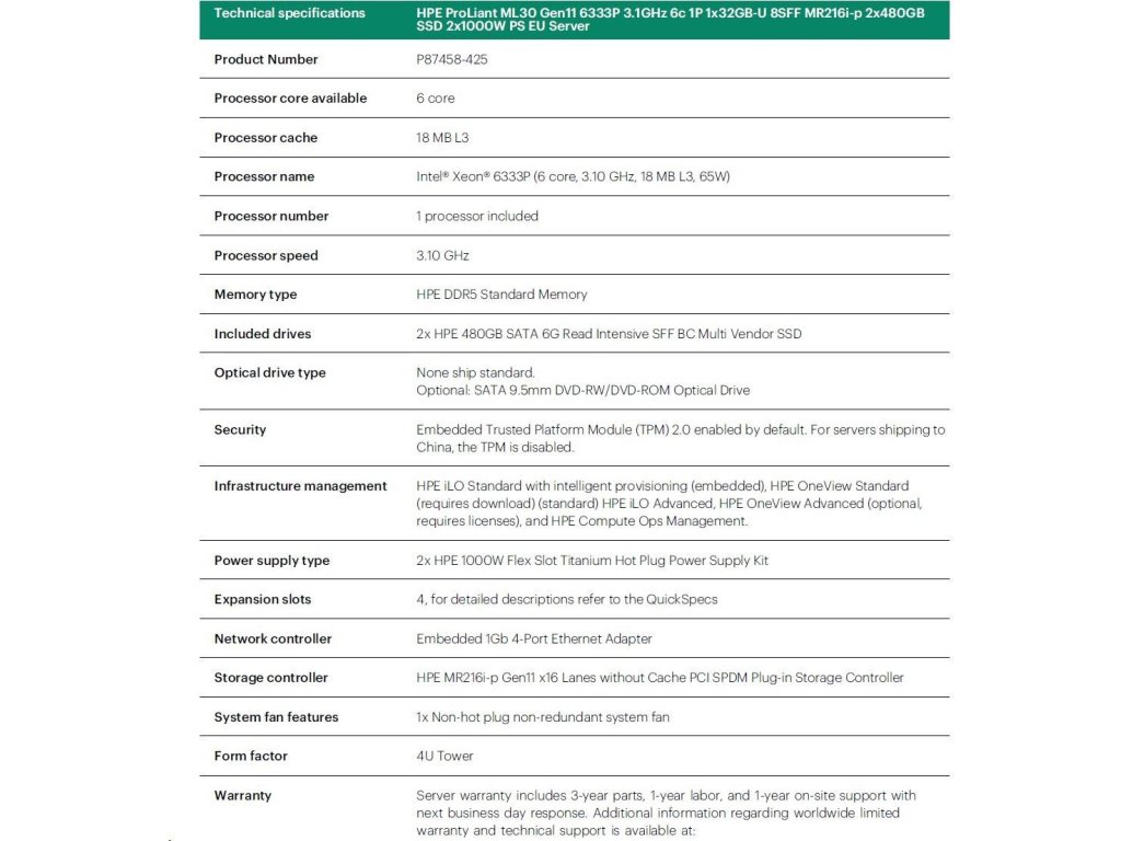 HPE PL ML30g11 6333P (3.1G/6C12T) 1x32G 2x480G 2x1000W MR216i-p 8SFF 4p1G NBD311 Smart Choice