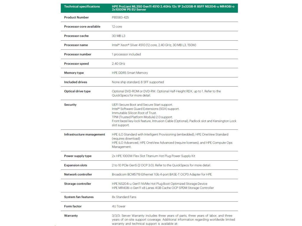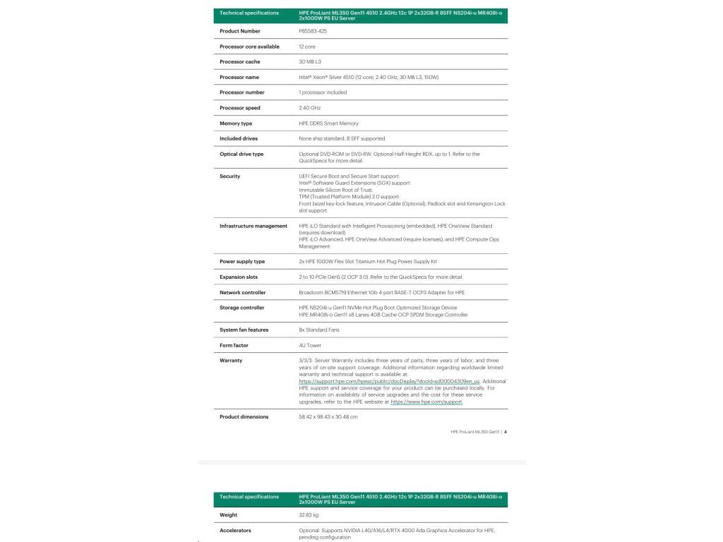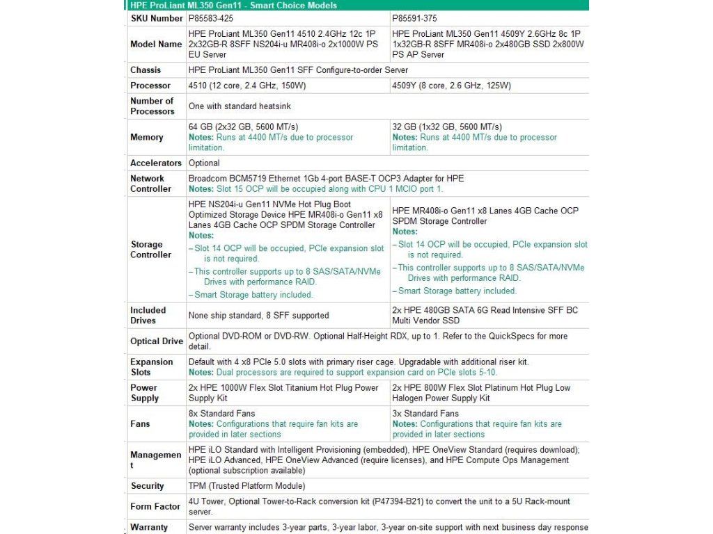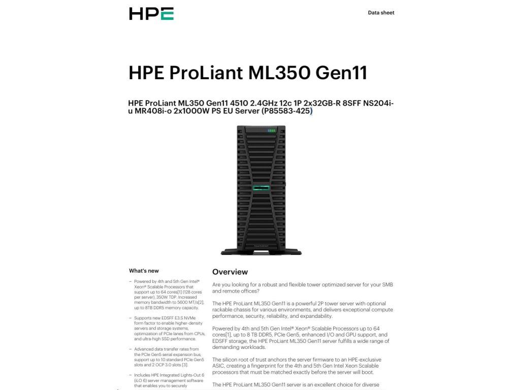 HPE PL ML350g11 4510 (2.4G/12C) 2x32G (P64706) NS204(2x480) MR408i-o 2x1000W 8SFF 4p1Gb Smart Choice