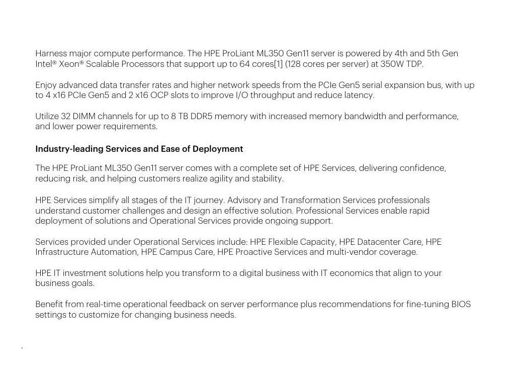 Prevedenie servera:Tower; Typ procesora:Intel 12 Core Xeon; Počet slotov PCIe:6 a více; Hot-plug cage pre HDD:2.5" SFF; RAID:1, 5, 10; Redundantné ventilátory:Voliteľne; Redundantný zdroj; Počet inštalovaných HDD:2; Počet inštalovaných procesorov:1