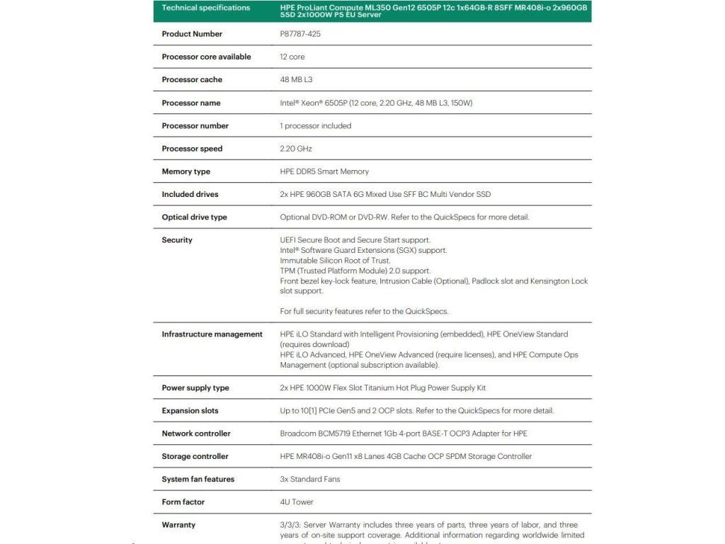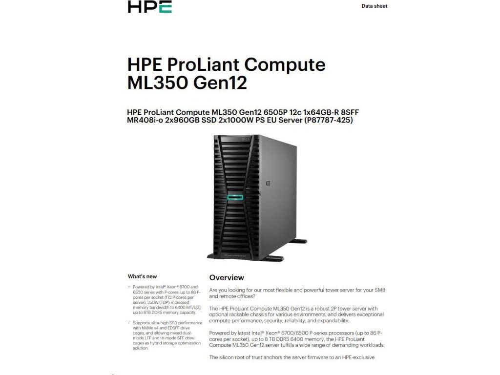 HPE PL ML350g12 6505P (2.2/12C) 1x64G (P69728) 2x960G MR408i-o 8SFF 2x1000W 1GbE NBD333 Smart Choice