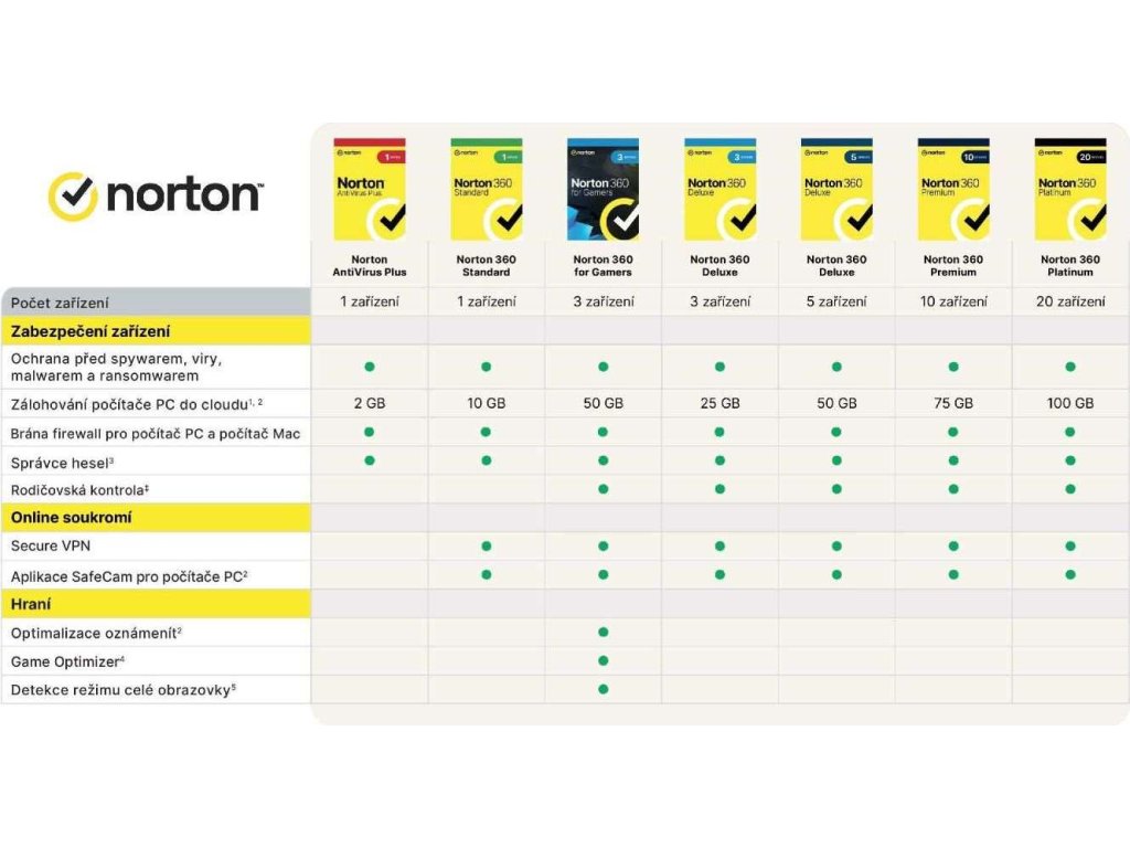 Elektronická licencia Norton 360 Deluxe poskytuje komplexnú ochranu proti škodlivému softvéru až pre 3 počítače PC, Mac, zariadenia so systémom Android alebo iOS, ako aj rodičovskú kontrolu, ktorá pomáha chrániť vaše deti online, správcu hesiel na ukladanie a správu hesiel a funkciu zálohovania z PC do cloudu. Norton 360 Deluxe obsahuje aj sieť VPN pre 3 zariadenia a aplikáciu na ochranu fotoaparátu pre počítače. Určené pre nových používateľov a na obnovenie licencií existujúcich používateľov