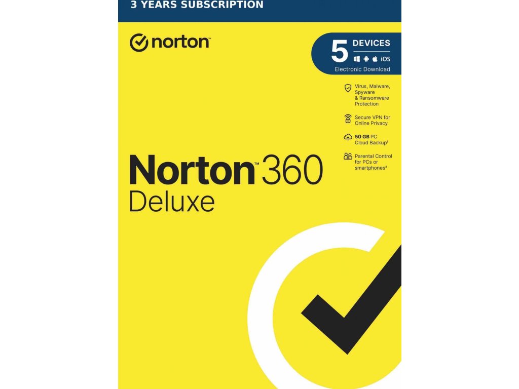 Elektronická licencia Norton 360 Deluxe poskytuje komplexnú ochranu proti škodlivému softvéru až pre 5 počítačov PC, Mac, zariadení so systémom Android alebo iOS, ako aj rodičovskú kontrolu, ktorá pomáha chrániť vaše deti online, správcu hesiel na ukladanie a správu hesiel a funkciu zálohovania z PC do cloudu. Norton 360 Deluxe obsahuje aj sieť VPN pre 5 zariadení a aplikáciu na ochranu fotoaparátu pre počítače. Určené pre nových používateľov a na obnovenie licencií existujúcich používateľov