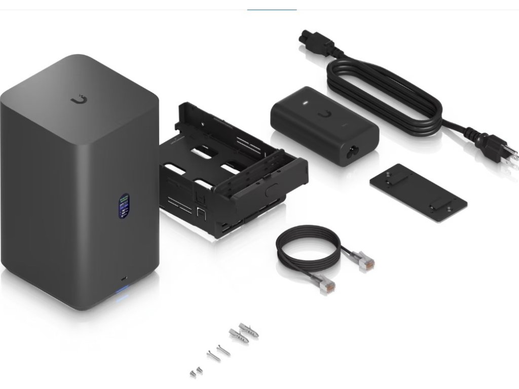 UniFi Network Attached Storage with (2) 3.5" HDD bays, 2.5 GbE networking, USB-C connectivity, and an included PoE++ adapter, all in a compact footprint.