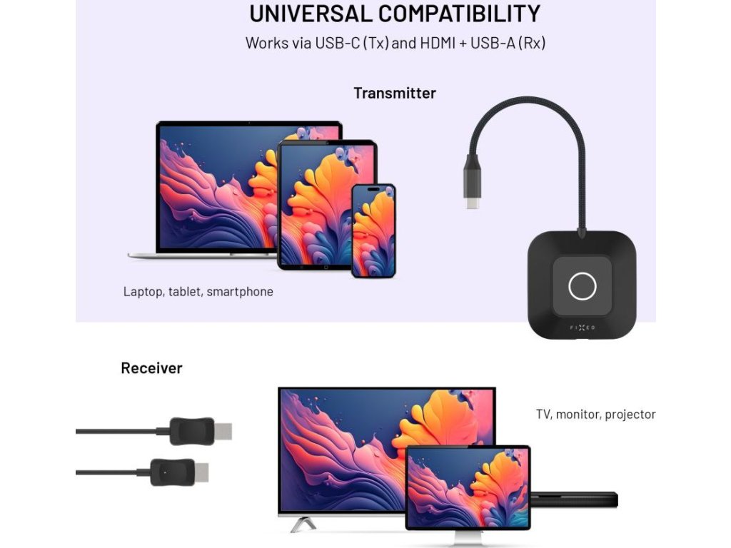 Bezdrátový HDMI adaptér FIXED AirLink umožní snadné streamování obrazu z notebooku na televizi, monitor či projektor bez nutnosti dalších kabelů nebo instalace aplikací a ovladačů. Stačí zapojit kompaktní vysílač do USB-C portu notebooku či jiného zařízení s funkcí přenosu dat, přijímač připojit do HDMI a USB portu zobrazovacího zařízení a jedním stiskem tlačítka obě části spárovat. Během okamžiku dojde k propojení a již můžete využívat plynulého zrcadlení obrazu. Adaptér podporuje rozlišení Full HD 1080p při 60 Hz a nabízí režim zrcadlení i rozšířené plochy, což oceníte jak při práci, tak zábavě. Díky minimální latenci v řádu maximálně 10 milisekund je obraz přenášen prakticky v reálném čase, bez viditelného zpoždění při sledování videí, filmů nebo prezentací. FIXED AirLink zároveň umožňuje rychlé průchozí nabíjení přes USB-C port s podporou Power Delivery o výkonu až 100W, takže můžete pohodlně sdílet a zároveň notebook napájet. Adaptér je kompatibilní s Windows, macOS, iOS i Android zařízeními, která mají USB-C nebo Thunderbolt 3/4 port s podporou DisplayPort Alt Mode. Dosah přenosu činí 30 metrů a odolný 20 cm opletený kabel zajišťuje dlouhou životnost. S FIXED AirLink přenášejte obraz zcela bezstarostně a kdekoliv.