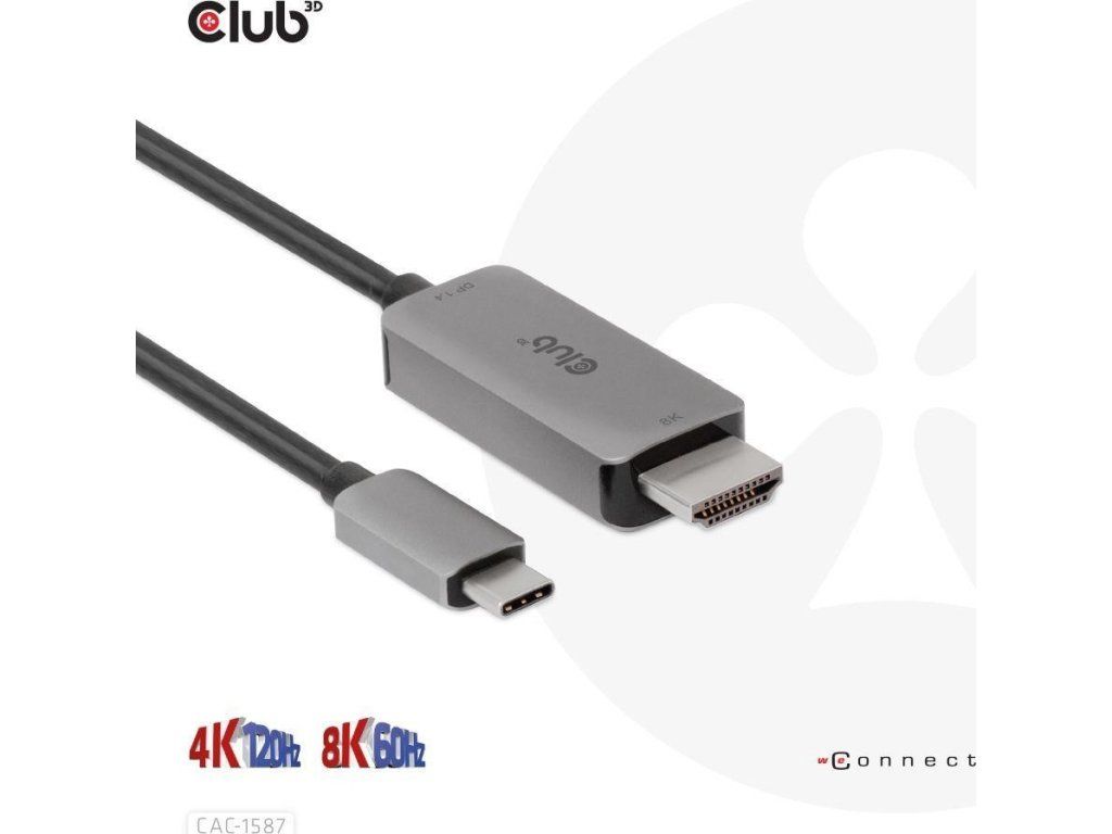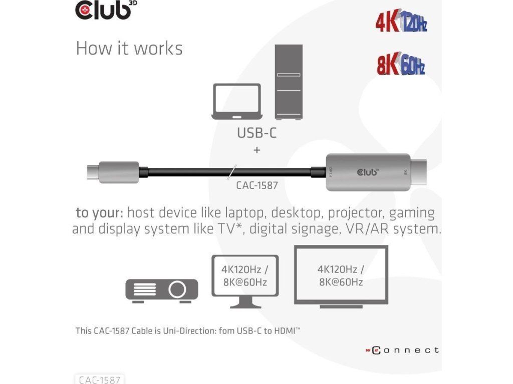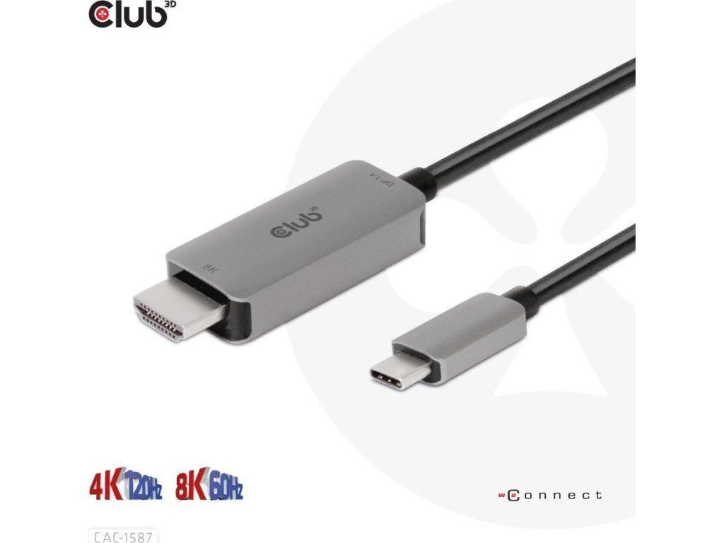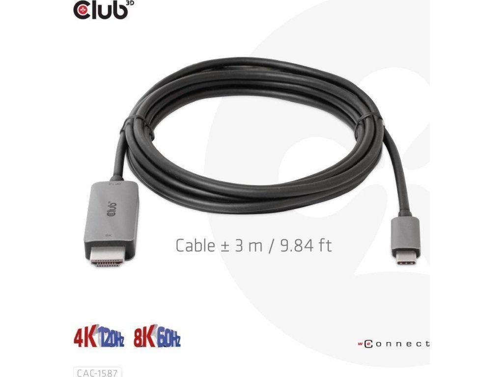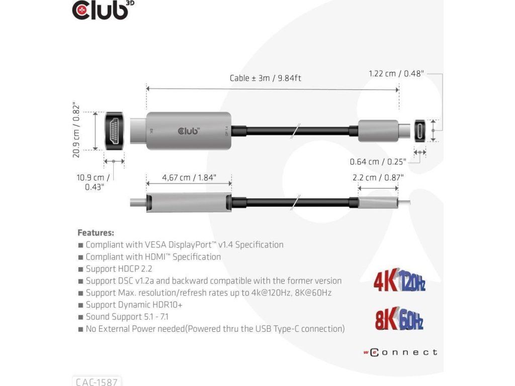 Club3D kabel USB-C na HDMI, 4K120Hz 8K60Hz HDR10 s DSC1.2, Aktivní kabel, M/M, 3m