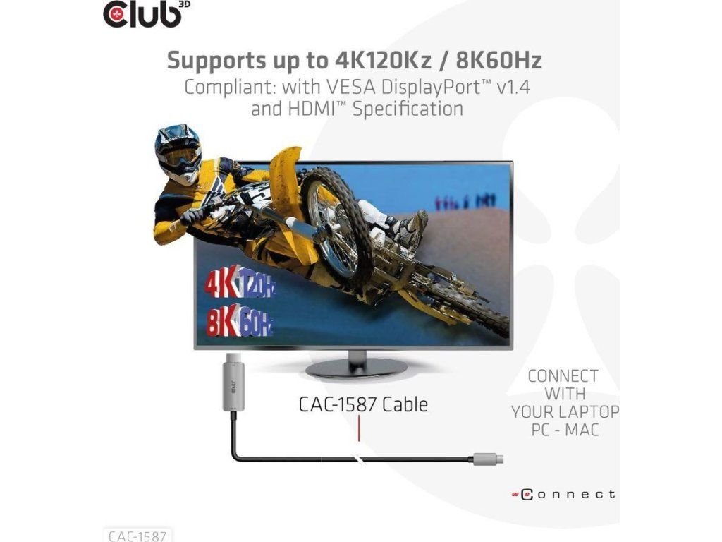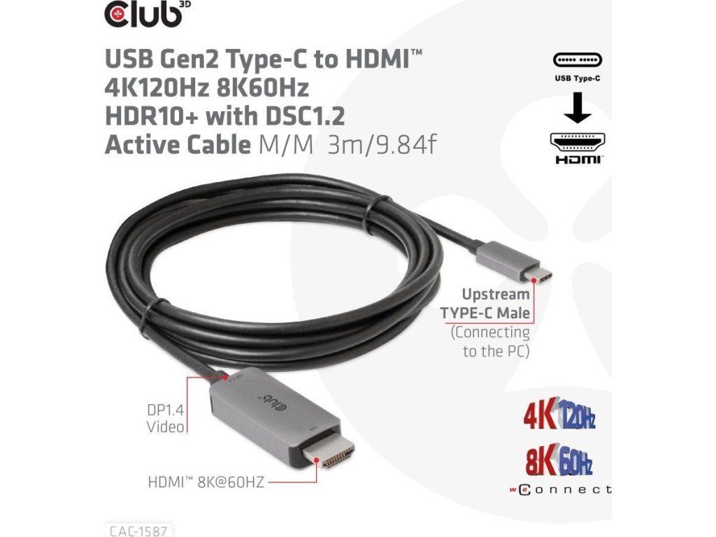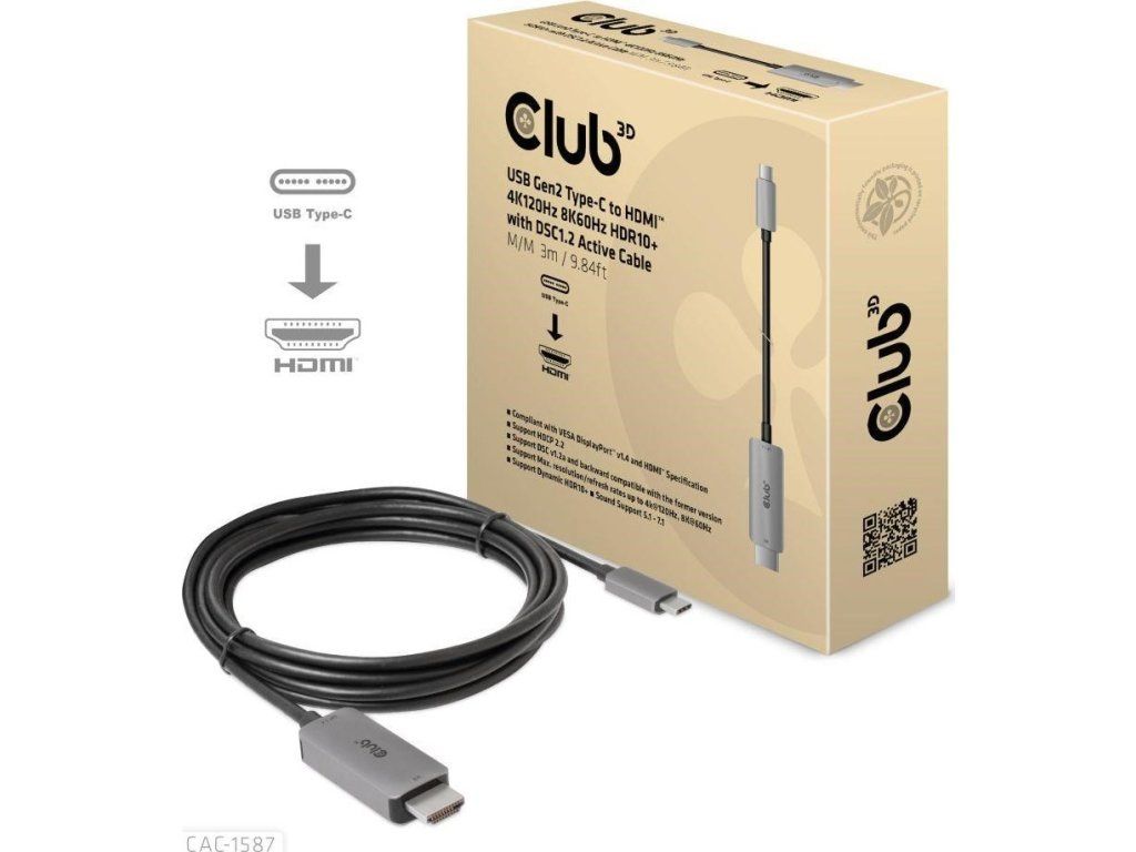 Club 3D CAC-1587 USB Gen2 Type-C na HDMI™ 4K120Hz 8K60Hz HDR10+ s DSC1.2 Aktívny kábel M/M 3 m/9.84ft., je dokonalým riešením na pripojenie k akémukoľvek displeju HDMI™ 8K60Hz* alebo 4K120Hz ready. V prípade, že máte DisplayPort™ Alt Mode 1.4 pripravený počítač s pripojením USB Gen2 typu C alebo akékoľvek iné zariadenie, ktoré nemá novú špecifikáciu HDMI™ 8K60Hz alebo 4K120Hz, bude Club3D CAC-1587 jednoduchým spôsobom, ako upgradovať vaše zariadenie a pripojiť ho k novému televízoru*. So svojím DP1.4 Alt Mode DSC technológia kompresie videa, tento kábel je schopný previesť DP1.4 Alt Mode video signály do HDMI™ , podporuje rozlíšenie zobrazenia videa až do 8K (7680 x 4320)@60Hz** a vytvára farby a pohyby ako živé s HDR10+, čo používateľom poskytuje dokonalý vizuálny zážitok. Kábel je napájaný cez pripojenie USB Gen2 Type-C.