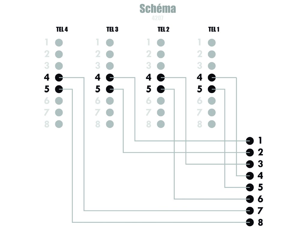 - adaptér pro sdružení 4 telefonních linek (2 žíly) do jednoho 4 párového kabelu