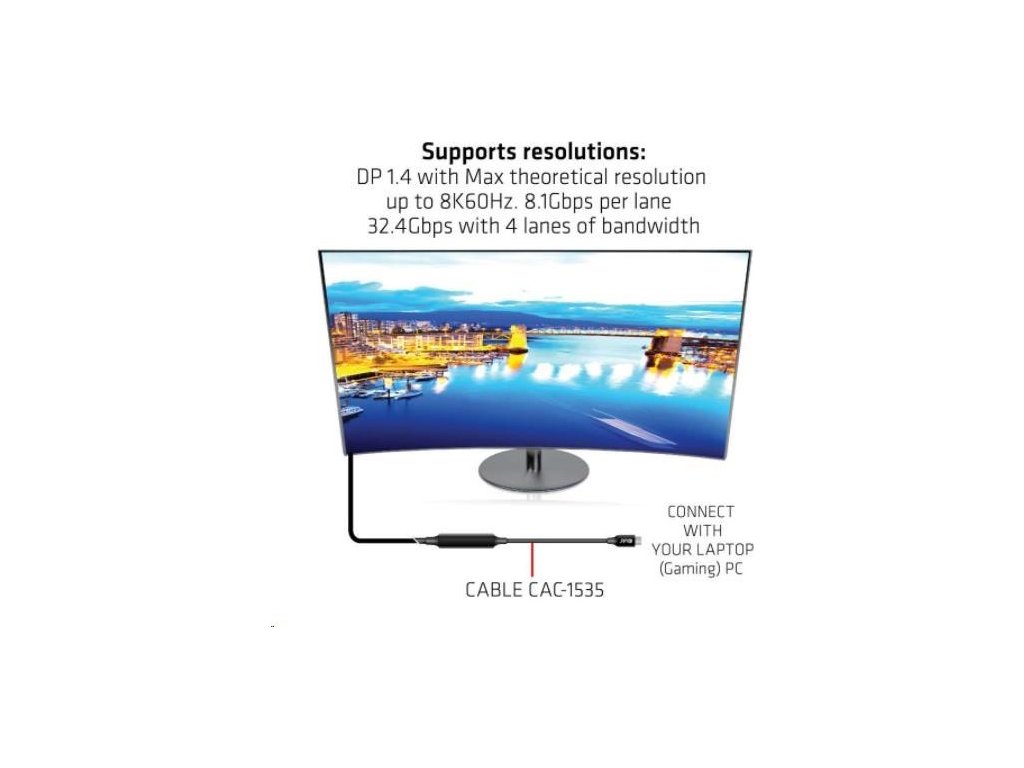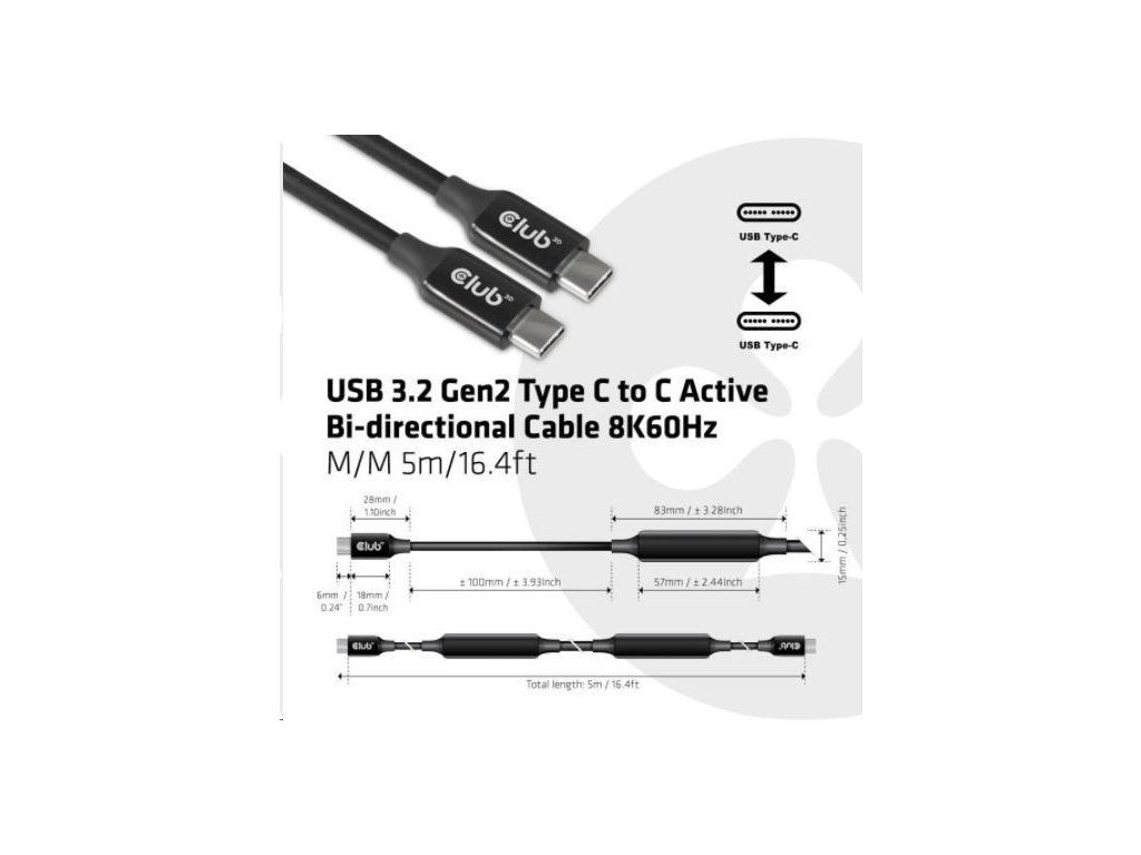 Club 3D CAC-1535 je obojsmerný aktívny kábel z USB typu C na USB typu C s čipovou sadou Re-timer na zlepšenie videa, dát a napájania, ktorý dosahuje dĺžku až 5 metrov/16.40ft . Pre video je kompatibilný s DP1.4 štandardov s teoretickým rozlíšením až 8K@60Hz. Pre dáta je kompatibilný s USB3.2 Gen 2 s maximálnou rýchlosťou prenosu dát 10 Gb/s a v prípade napájania je schopný dodať maximálne 60 W (20 V/3 A) PD Charging.