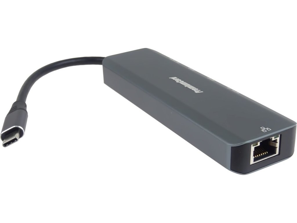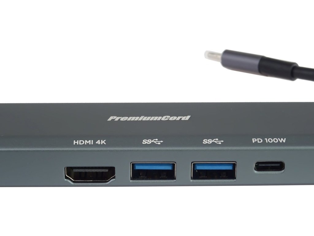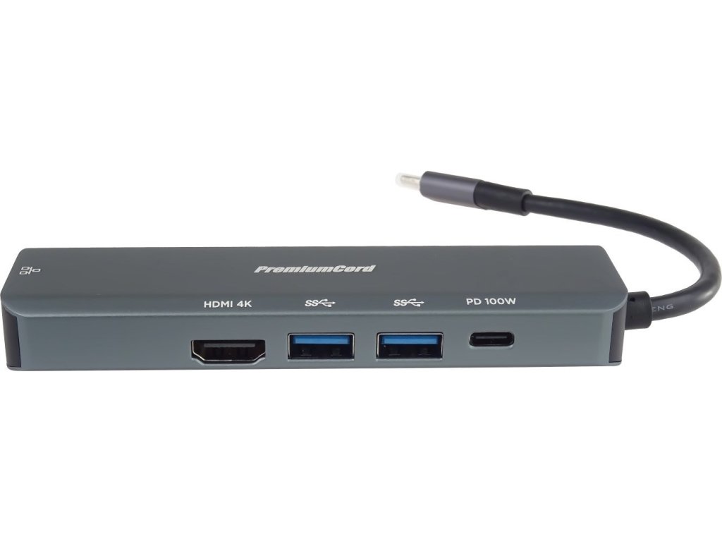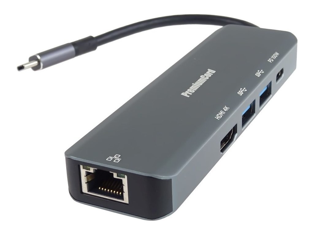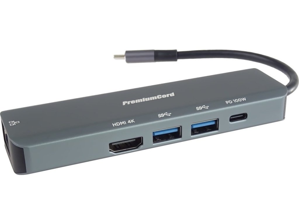 PREMIUMCORD Adaptér USB-C na Gigabit 10/100/1000Mbps + 1x HDMI, 2x USB3.2, 1x PD 100W konektor, Šedá