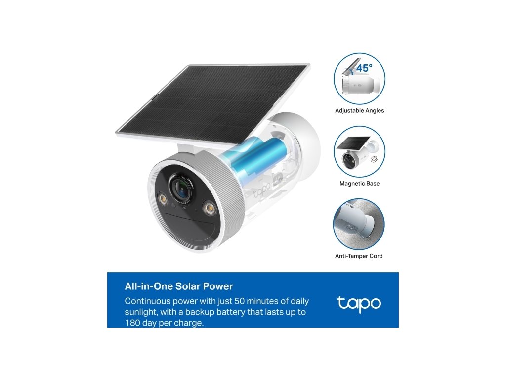 Vychutnejte si dokonale ostrý 4K obraz, dlouhou výdrž na baterii a celodenní provoz pomocí vestavěného solárního panelu. Tapo C465 vám díky AI detekci, dvoupásmové Wi-Fi a odolnosti IP65 zajistí spolehlivé zabezpečení kdekoliv na pozemku – bez kabelů a bez kompromisů.