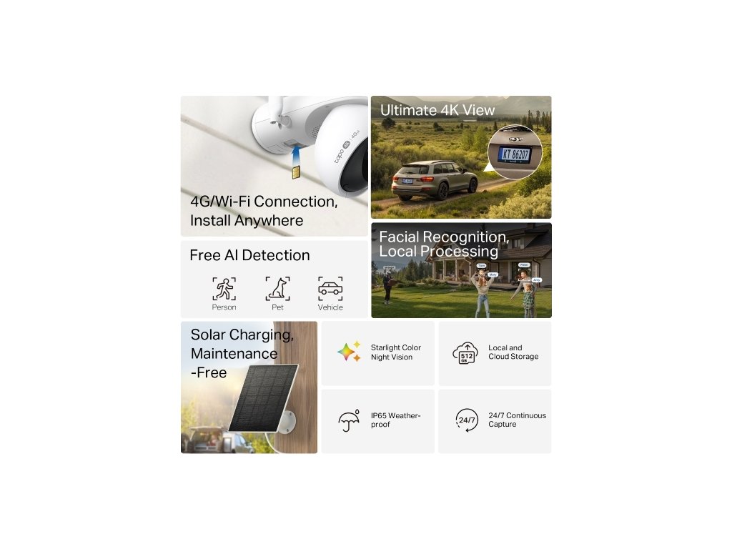 Kamera Tapo C665G KIT nabízí maximální flexibilitu a spolehlivý dohled i na místech bez elektřiny nebo pevného internetu. Díky solárnímu napájení a vestavěné baterii je zařízení téměř bezúdržbové. Kamera poskytuje ostrý obraz ve 4K (8MP) s možností 18× digitálního zoomu a umožňuje plynulé sledování díky otáčení (pan) a náklonu (tilt).