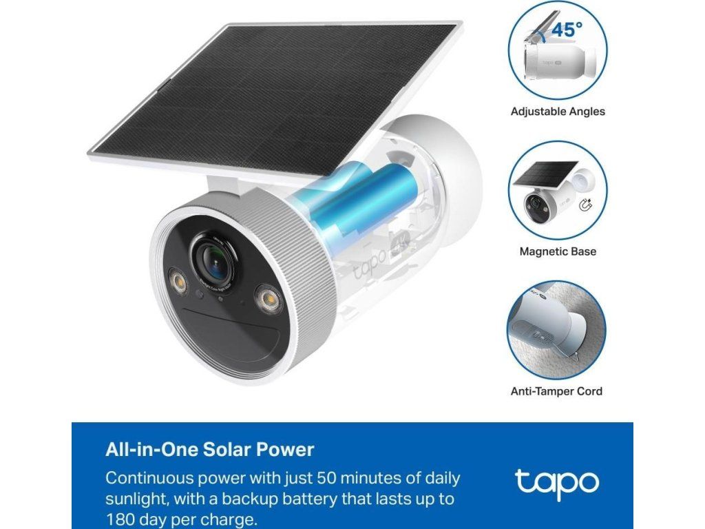 Vychutnejte si dokonale ostrý 4K obraz, dlouhou výdrž na baterii a celodenní provoz pomocí vestavěného solárního panelu. Tapo C465 vám díky AI detekci, dvoupásmové Wi-Fi a odolnosti IP65 zajistí spolehlivé zabezpečení kdekoliv na pozemku – bez kabelů a bez kompromisů.