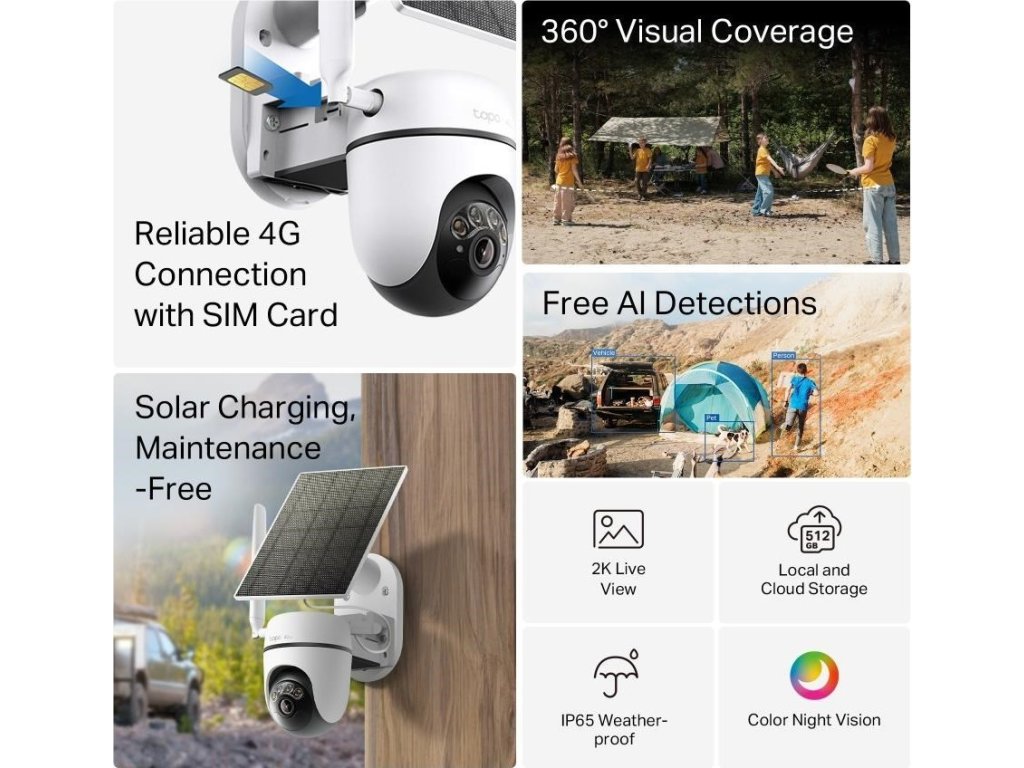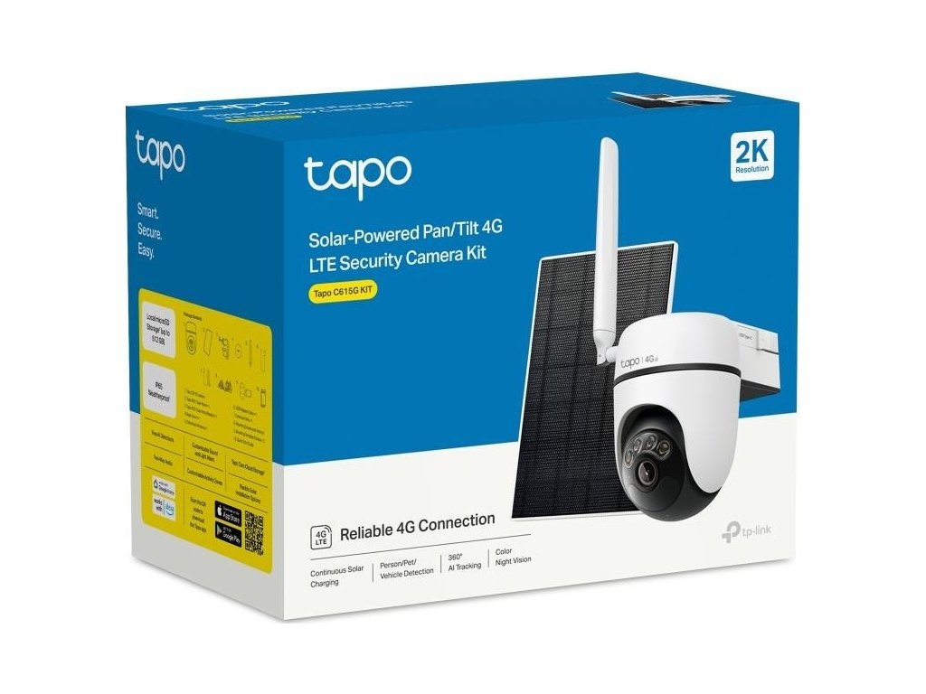 | Package Content | Tapo C615G Kamera Tapo A201 Solárny panel × 1 Držiak solárneho panelu Tapo A201 × 1 Základná krytka × 1 Odomydateľná anténa × 1 USB adaptér kábel × 1 Prídavný kábel × 1 Montážne skrutky a hmoždinky Montážne šablóny nalepovacie samolepky × 2 Rýchly návod na použitie |