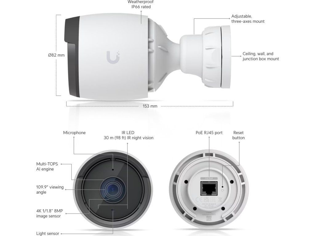 UniFi G6 Bullet kamera disponuje 8MP snímačem s rozlišením 3840 x 2160 při 30fps a objektivem s pozorovacím úhlem 109.9°, který je vybaven IR přísvitem pro noční vidění do vzdálenosti 30m. Dále je kamera vybavena mikrofonem pro záznam zvuku, 10/100 Mbps LAN portem s podporou PoE a stupněm krytí IP66 pro použití ve venkovním prostředí. Díky držáku jste schopni obraz směrovat ve všech 3 osách.