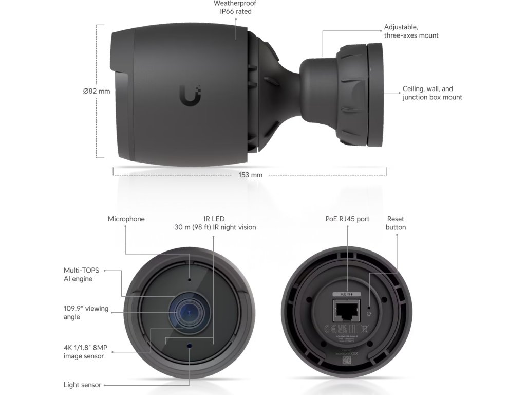 UniFi G6 Bullet kamera disponuje 8MP snímačem s rozlišením 3840 x 2160 při 30fps a objektivem s pozorovacím úhlem 109.9°, který je vybaven IR přísvitem pro noční vidění do vzdálenosti 30m. Dále je kamera vybavena mikrofonem pro záznam zvuku, 10/100 Mbps LAN portem s podporou PoE a stupněm krytí IP66 pro použití ve venkovním prostředí. Díky držáku jste schopni obraz směrovat ve všech 3 osách.
