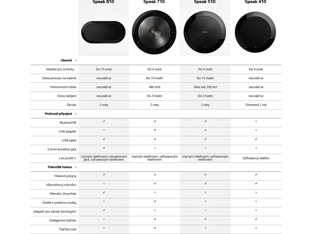 - Jabra SPEAK 510+: stejné funkce jako 510, navíc umožňuje propojit PC přes Bluetooth, součástí balení je BT USB adaptér