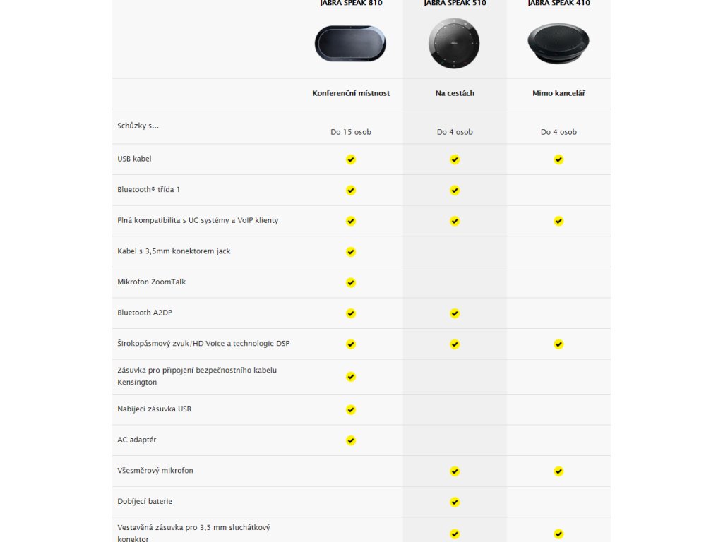 - Jabra SPEAK 510: stejné funkce jako 410, navíc obsahuje Bluetooth pro propojení k tabletu/smartphone