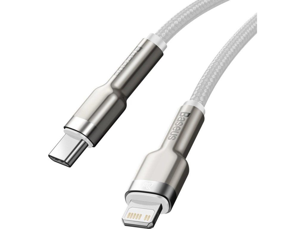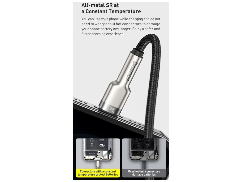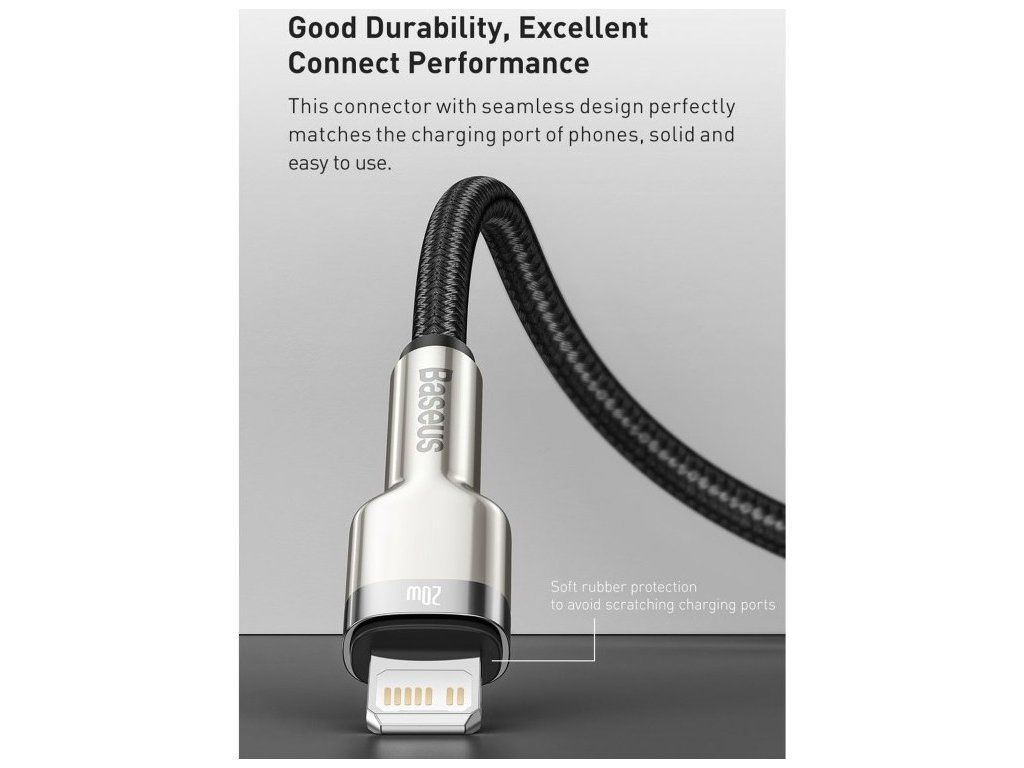 Kábel BASEUS Cafule Metal Series je odolný kábel, ktorého koncovky sú potiahnuté zliatinou zinku, aby vydržali dlhé a náročné používanie. Výrobok je tiež vybavený špeciálnym nylonovým opletením, ktoré zabraňuje treniu a chráni káble vo vnútri. Zlepšila sa aj odolnosť konektorov - boli testované na 10 000 spojení a boli špeciálne profilované tak, aby sa kábel dal používať aj vtedy, keď je telefón v puzdre. Kábel má funkciu rýchleho nabíjania a prenosu dát PD 20 W. Jeho dĺžka je 100 cm.