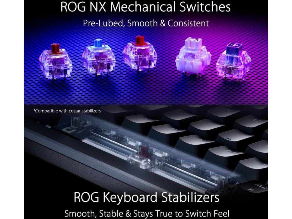 - Mechanické spínače ROG NX vymeniteľné za chodu: Predom namazané spínače pre plynulejšie cvaknutie a elimináciu odskakovania; rýchle ovládanie a vyladené krivky sily ROG poskytujú skvelý pocit a konzistenciu kláves
