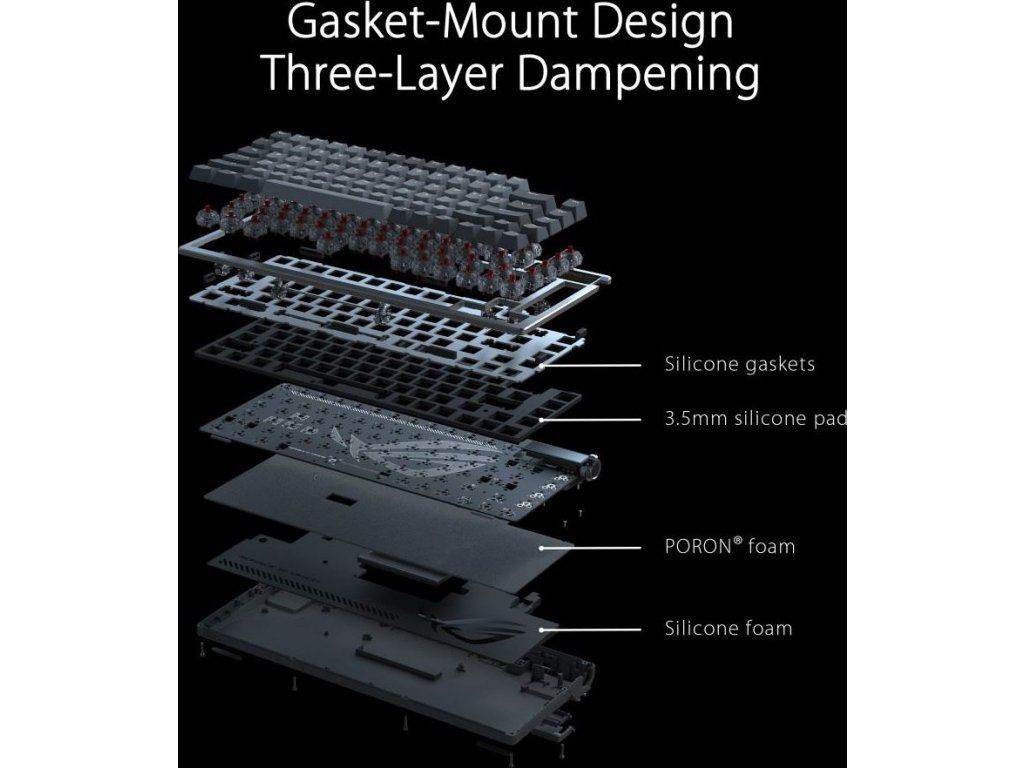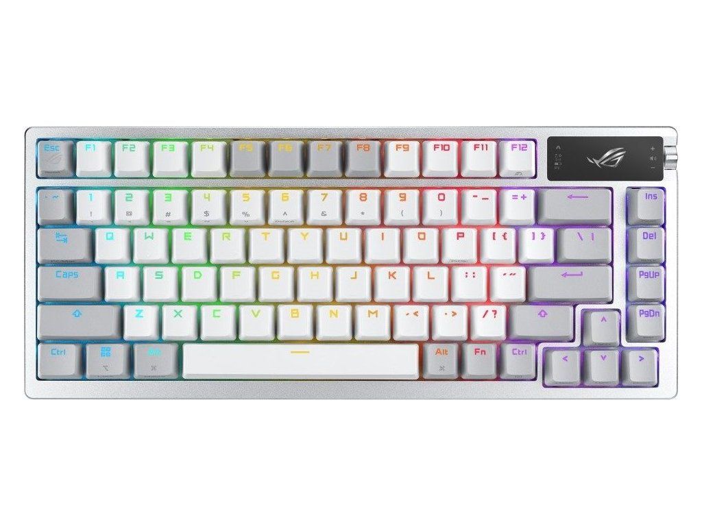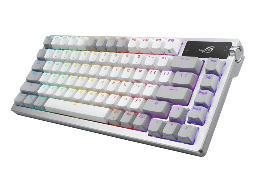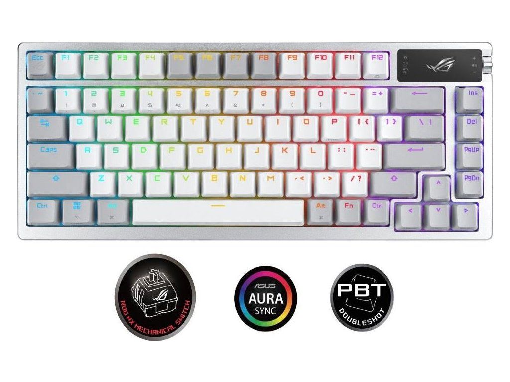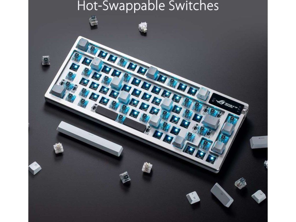 Zakázková herná klávesnica ROG Azoth s tvarovým faktorom klávesnice 75, tesnením, trojvrstvou tlmiacou penou a kovovým horným krytom, vysoko prispôsobiteľná s predom namazanými mechanickými spínačmi ROG NX vymeniteľnými za chodu, stabilizátory klávesnice ROG, kryty kláves PBT doubleshot a mazacou sadou, tri režimy pripojenia s technológiou SpeedNova na 2,4 GHz, OLED displejom, trojcestným ovládacím gombíkom, tromi uhlami náklonu a podporou Mac