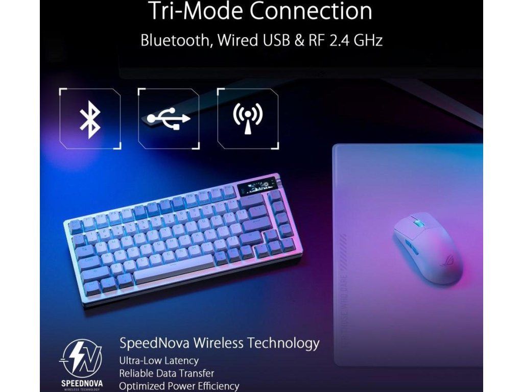- Pripojenie v troch režimoch: Použite Bluetooth na pripojenie a prepínanie medzi tromi zariadeniami naraz, bezdrôtová technológia ROG SpeedNova zabezpečuje až 2 000+ hodín hrania s nízkou latenciou v bezdrôtovom režime 2,4 GHz RF (OLED a RGB vypnuté), alebo použite štandardný káblový USB