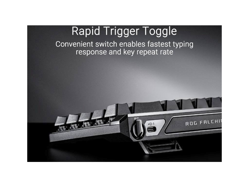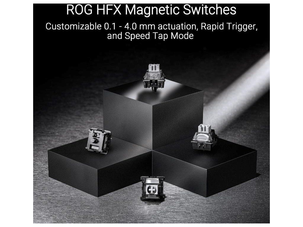 - Magnetické spínače ROG HFX: Má nastaviteľné ovládanie 0,1 - 4,0 mm pre okamžitý stlač klávesov