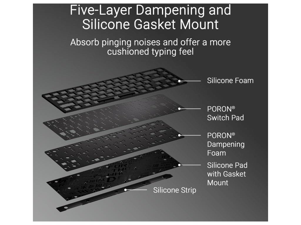 - Vylepšené možnosti písania: Integrované päťvrstvové tlmenie a silikónové tesnenie pohlcujú zvuky cinkania a ponúkajú tlmenejší pocit pri písaní