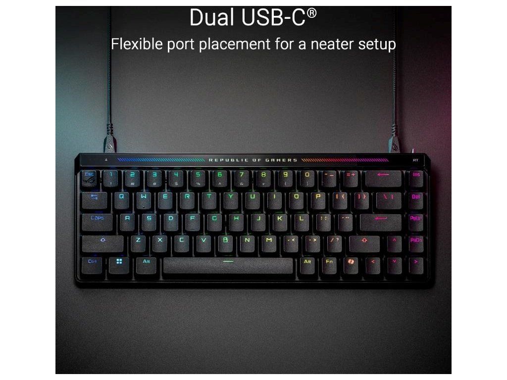 ROG Falchion Ace HFX 65% analógová herná klávesnica s magnetickými spínačmi ROG HFX, prepínač Rapid Trigger, režim Speed ??Tap, interaktívny dotykový panel, obnovovacia frekvencia 8000 Hz, päťvrstvové tlmenie a silikónové tesnenie, duálne porty Type-C, tri uhly sklonu a krycie puzdro