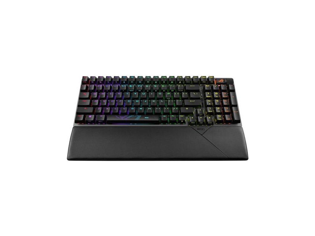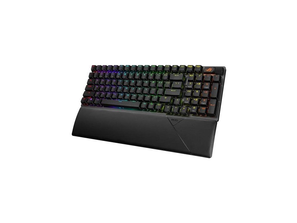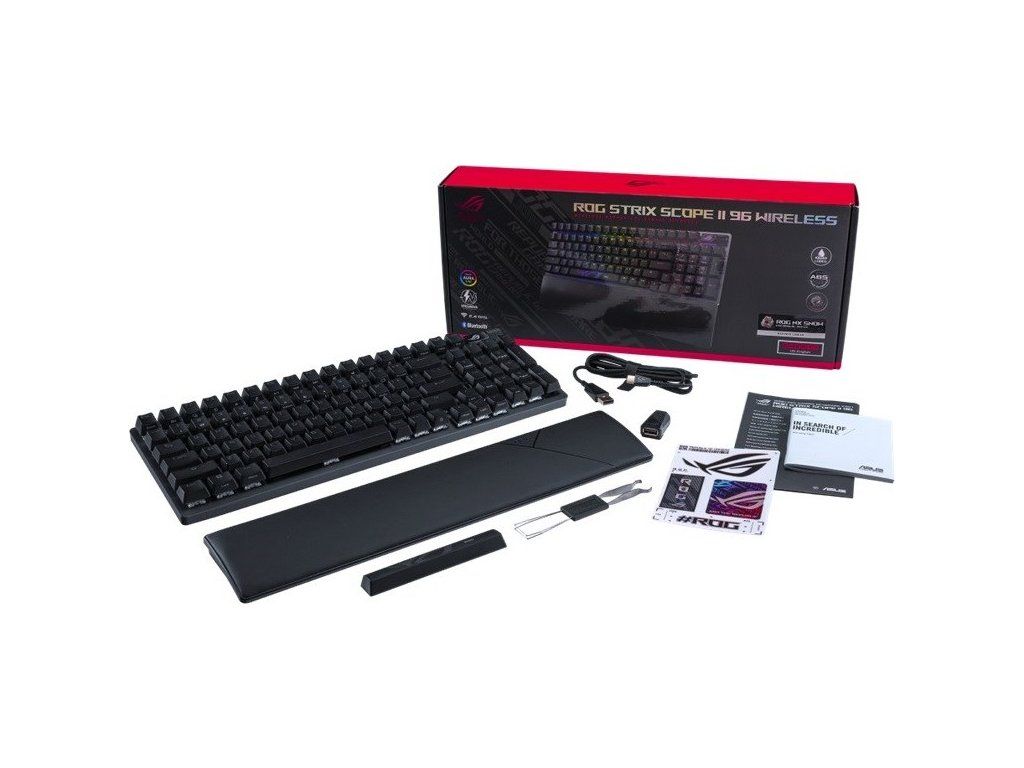 Bezdrôtová herná klávesnica ROG Strix Scope II 96 s pripojením v troch režimoch, klávesové skratky pre streamovanie, multifunkčné ovládacie prvky, mechanické spínače ROG NX s možnosťou výmeny za prevádzky, stabilizátory klávesnice ROG, krytky kláves PBT doubleshot a silikónová tlmiaca pena, tri uhly sklonu a opierka zápästia