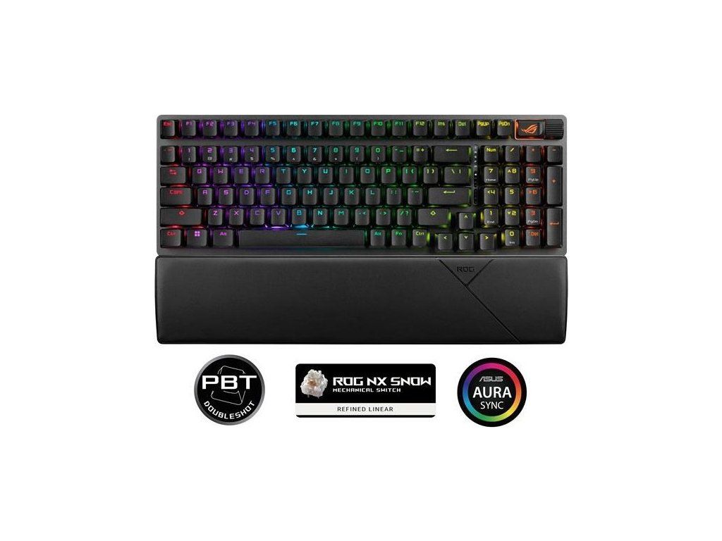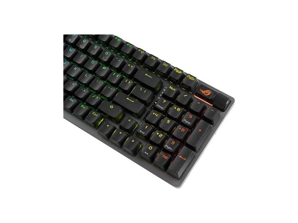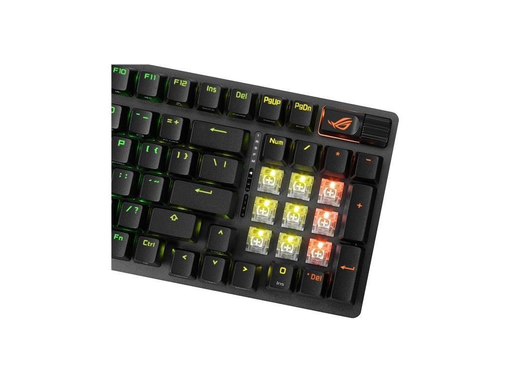 - Vylepšené možnosti písania: Predmazaané stabilizátory klávesnice produkujú menšie trenie pre hladšie stlačenie kláves a stabilitu pre dlhšie klávesy; odolné krytky kláves ROG PBT doubleshot alebo krytky kláves ABS s UV vrstvou ponúkajú prvotriedny pocit a odolnosť voči lesku