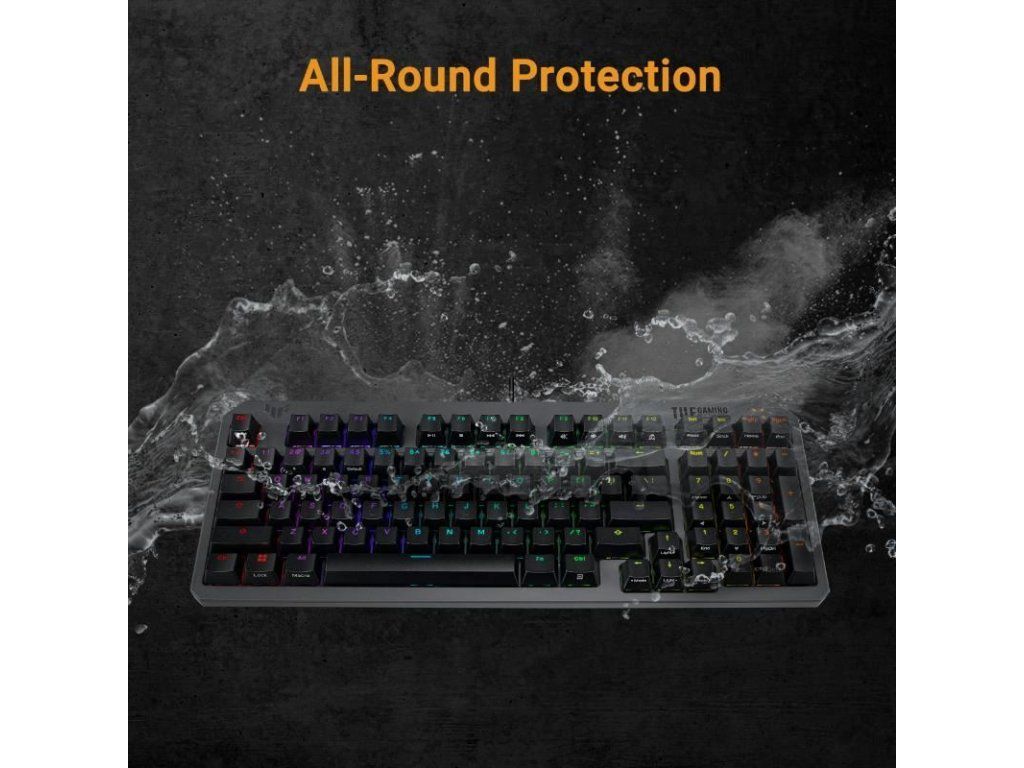 Klávesnica ASUS TUF Gaming K3 Gen II s kompaktným rozložením 97 kláves, opticko-mechanickými RGB prepínačmi, silikónovým tesnením, tlmiacou penou, vodotesnosťou IP57, odnímateľnou vrchnou doskou a kompatibilitou Aura Sync.