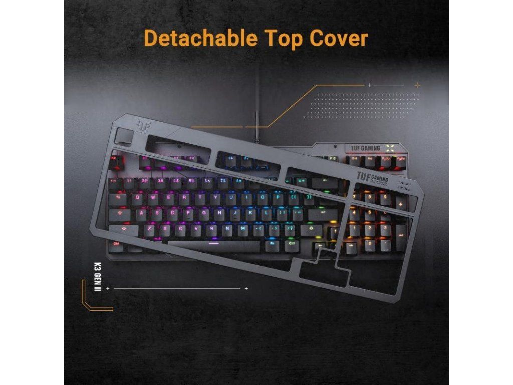 Klávesnica ASUS TUF Gaming K3 Gen II s kompaktným rozložením 97 kláves, opticko-mechanickými RGB prepínačmi, silikonovým tesnením, tlmiacou penou, vodotesnosťou IP57, odnímateľnou hornou doskou a kompatibilitou Aura Sync.