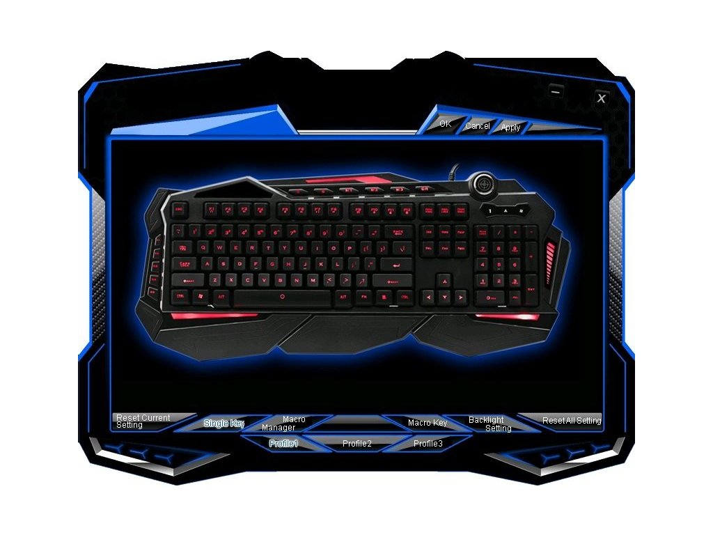 3 profily - na klávesnici nájdete tlačidlá na prepínanie medzi 3 nezávislými profilmi. Pre každý profil môžete individuálne nastaviť farbu podsvietenia, jeho intenzitu, makrá a preddefinované klávesy...