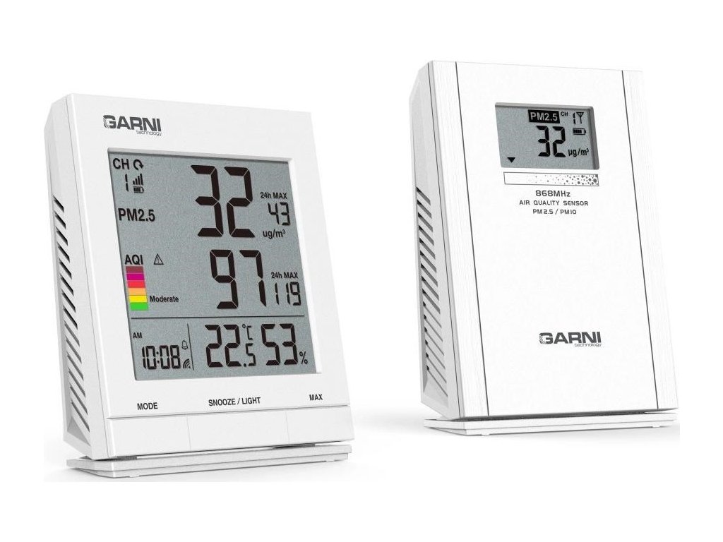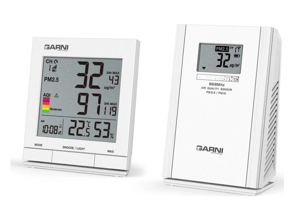 Merač kvality ovzdušia GARNI 204 OneCare je určený na vnútorné použitie. Meria a zobrazuje na svojom LCD displeji hodnoty kvality ovzdušia – koncentráciu pevných častíc PM2.5 a PM10 nameranú bezdrôtovým senzorom GARNI 104Q (jeden bezdrôtový senzor je súčasťou balenia) a tiež teplotu a relatívnu vlhkosť. Pre meranie pevných častíc (PM) je použité švajčiarske čidl? SENSIRION radu SPS ? meranie pevných častíc (PM) PM2.5 a PM10 bezdrôtovým senzorom GARNI 104Q ? hlavná jednotka meria teplotu a relatívnu vlhkosť a zobrazuje hodnoty pevných častíc PM2.5, alebo PM10 namerané bezdrôtovým senzorom GARNI 104Q ? pre meranie pevných častíc sú použité presné švajčiarske čidlá SENSIRION radu SPS ? jednotkou PM sú µg/m3 ? prehľadný LCD displej hlavnej jednotky o rozmere 69 x 64 mm ? veľkosť číslic na displeji – čas 6,5 mm, teplota, relatívna vlhkosť 12 mm, aktuálna hodnota PM2.5, PM10 17 mm, maximálna hodnota 7 mm, aktuálna hodnota AQI 17 mm, maximálna hodnota 7 mm ? zobrazenie aktuálnych hodnôt PM2.5, PM10 a AQI, alebo priemerných hodnôt nameraných za 24 hodín ? indikácia kvality ovzdušia farebnou stupnicou AQI (Air Quality Index) a číselnou hodnotou AQI ? pamäť na maximálnu hodnotu PM2.5, PM10 a AQI od posledného vymazania pamäti, za poslednú hodinu a posledných 24 hodín alarm AQI upozorní na vysokú úroveň AQI na základe aktuálne nameranej hodnoty AQI alebo priemernej hodnoty za posledných 24 hodín. Jakmile je dosiahnutá hodnota, ktorá bola nastavená, aktivuje sa zvukové znamenie a na displeji hlavnej jednotky začne blikať ikona alarmu ? možnosť použitia až 4 bezdrôtových senzorov GARNI 104Q ? pri použití viacerých bezdrôtových senzorov GARNI 104Q možnosť automatického prepínania kanálov ? ikona signálu bezdrôtových senzorov ? čas riadený rádiovým signálom DCF-77 s možnosťou manuálneho nastavenia ? ikona prijmu signálu DCF-77 ? 12 alebo 24-hodinový formát zobrazenia času ? časová zóna -23 až +23 hodín ? zobrazenie teploty vo °C alebo °F ? automatické prepínanie letného a zimného času ? aktualizácia nameraných hodnôt – 60 sekúnd ? budík s funkciou Snooze (posunutie buzenia o 5 minút) ? možnosť krátkodobého osvetlenia displeja na 9 sekúnd ? ikona slabých batérií ? napájanie na batérie Bezdrôtové čidlo GARNI 104Q ? na vnútorné použitie ? displej o rozmere 37 x 21 mm ? veľkosť číslic 10 mm ? zobrazenie hodnoty kvality ovzdušia PM2.5 alebo PM10 ? 4 kanály ? zobrazenie čísla kanála, ikony slabých batérií, ikony vysielania a nabíjania na displeji ? vizualizácia kvality ovzdušia hodnotou koncentrácie na šestirúkovej stupnici ? aktualizácia a prenos nameranej hodnoty kvality ovzdušia pri napájaní USB adaptérom každých 60 sekúnd ? pri napájaní batériami meria bezdrôtové čidlo GARNI 104Q vo východiskovom nastavení koncentráciu PM2.5 a PM10 automaticky každých 10 minút. Pre maximalizáciu výdrže batérií je možné zmeniť interval merania z 10 minút na 20 alebo 30 minút ? dosah signálu až 100 m vo voľnom priestore ? frekvencia prenosu 868 MHz ? napájanie 3 x 1.2V NiMH nabíjacie batérie typu AA, alebo cez USB adaptér (adaptér nie je súčasťou balenia), nabíjanie cez USB (5V/1A) Obsah balenia 1 x hlavná jednotka 1 x bezdrôtové čidlo GARNI 104Q 3 ks nabíjacích batérií typ AA, 1,2 V, Ni-MH, 2000 mAh 1 x USB kábel 120 cm CZ, SK, EN návod, QR kód s odkazom na stiahnutie návodov DE, NL, PL, HU