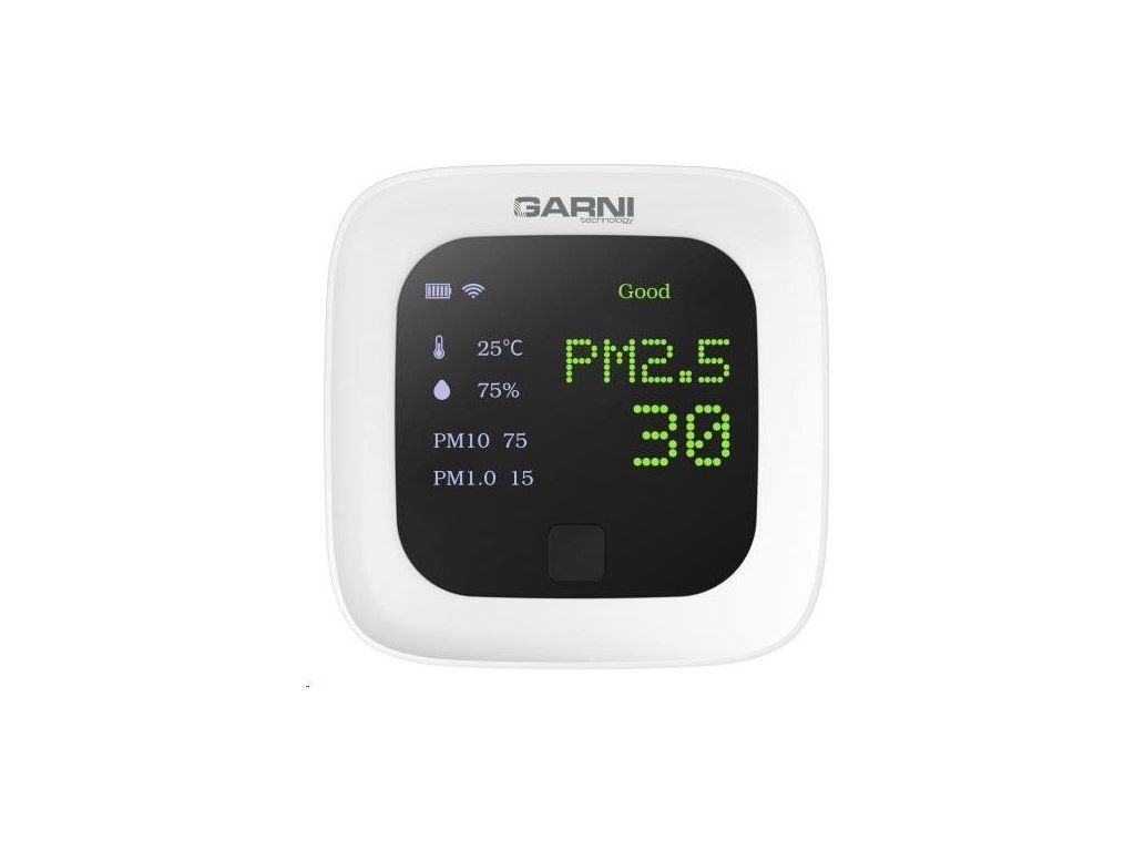 Chytrý merač kvality vzduchu GARNI 210T OneCare s WiFi modulom meria a zobrazuje na svojom farebnom TFT LCD displeji namerané hodnoty kvality vzduchu, teplotu a relatívnu vlhkosť vo vnútorných priestoroch. Je kompatibilný s platformou chytré domácnosti Tuya IOT. Umožňuje nahrávať namerané hodnoty online, zobrazovať ich v aplikácii Tuya Smart a prostredníctvom tejto aplikácie automaticky spúšťať iné zariadenia. Na meranie pevných častíc (PM), teploty a relatívnej vlhkosti sú použité švajčiarske snímače SENSIRION.