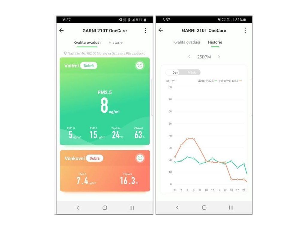 - Zobrazenie v aplikácii – aktuálna vnútorná nameraná hodnota PM2.5, PM1.0 a PM10, teplota, relatívna vlhkosť; vonkajšia hodnota PM2.5 a teplota získaná z internetu