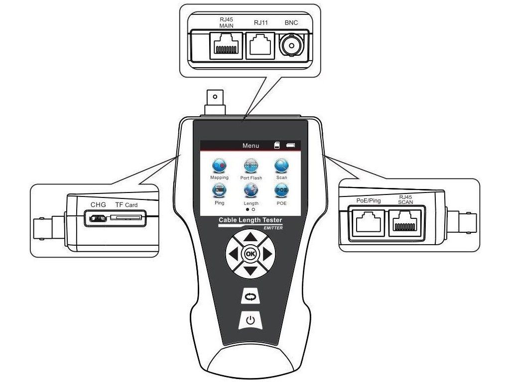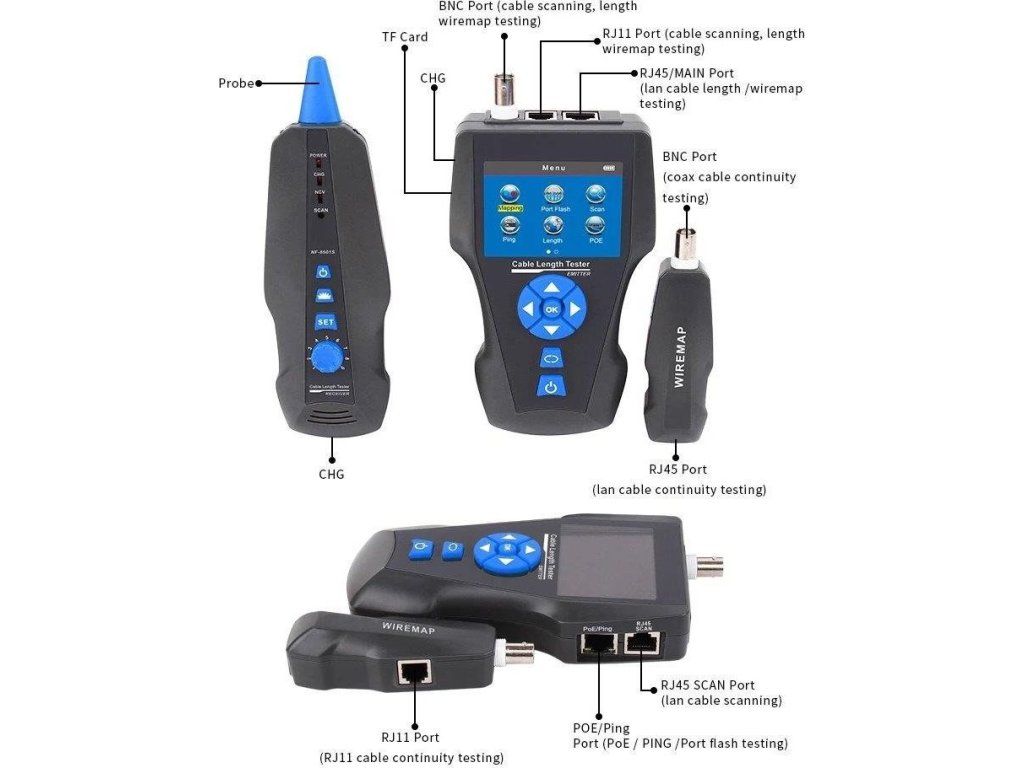 Pokročilý tester na testovanie a diagnostiku rôznych typov káblov/vedení. Využíva technológiu TDR (Time Domain Reflectometry) na presnú lokalizáciu a identifikáciu porúch v linkách. Zariadenie je vybavené veľkým LCD displejom, ktorý zobrazuje všetky relevantné informácie a podporuje viacjazyčné nastavenia. Okrem toho je vybavený vstavaným generátorom tónov a funkciou vyhľadávania portov, vďaka čomu je ideálny na testovanie sieťových káblov, telefónnych liniek a video káblov.