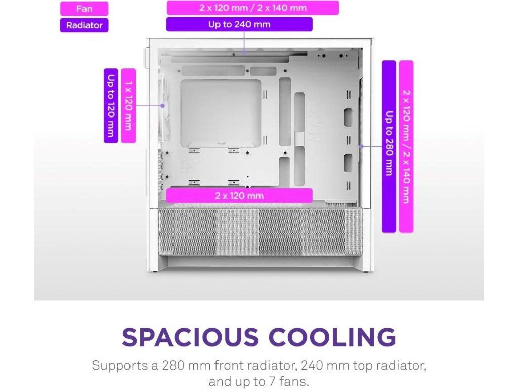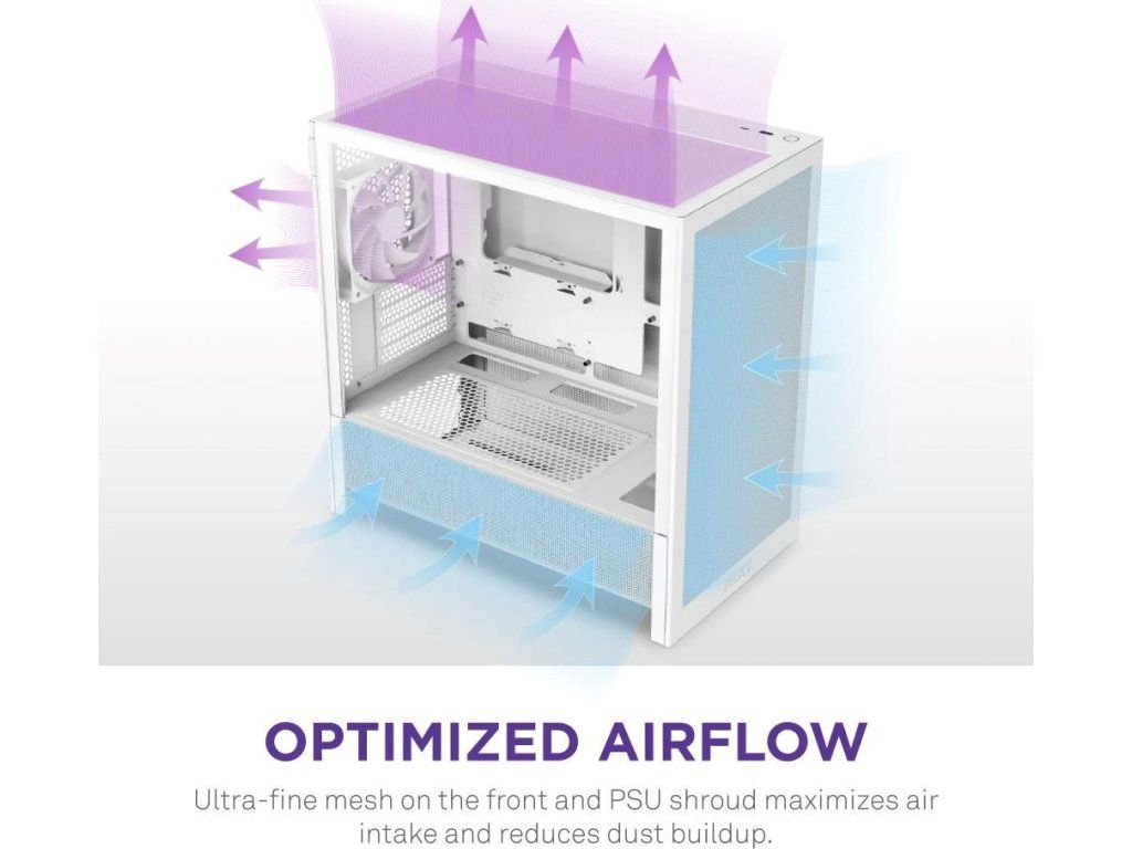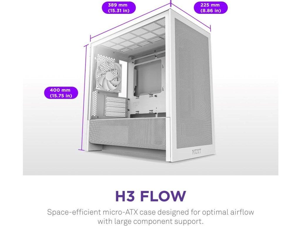 Skriňa H3 Flow micro-ATX kombinuje priestorovo úsporný dizajn s vysokým výkonom. Je navrhnutá tak, aby podporovala komponenty plnej veľkosti, a je vybavená panelmi s veľmi jemnou sieťovinou a odvetrávaným krytom zdroja, ktoré udržiavajú konzistentný a optimalizovaný prúdenie vzduchu v celej zostave.