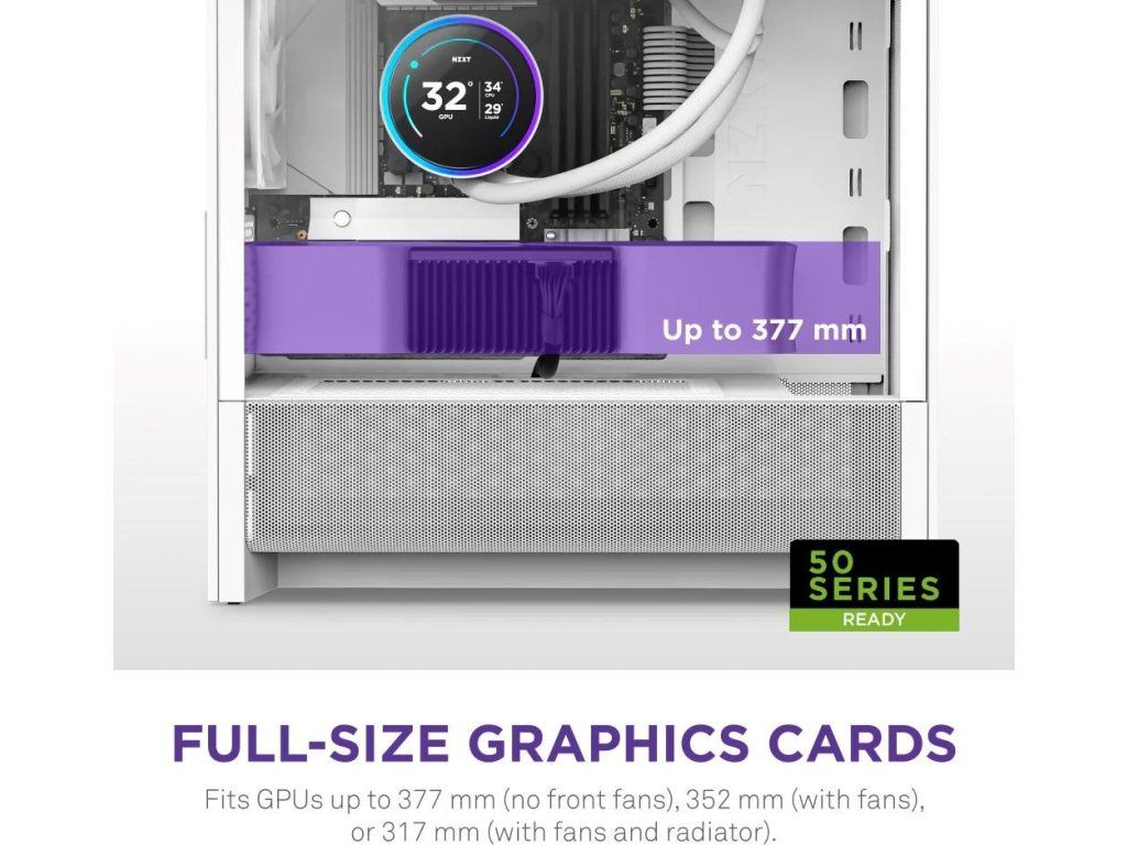 - Podpora GPU plnej veľkosti: Vhodná pre grafické karty do veľkosti 377 mm (bez predných ventilátorov), 352 mm (s prednými ventilátormi) alebo 317 mm (s predným radiátorom a nainštalovanými ventilátormi).