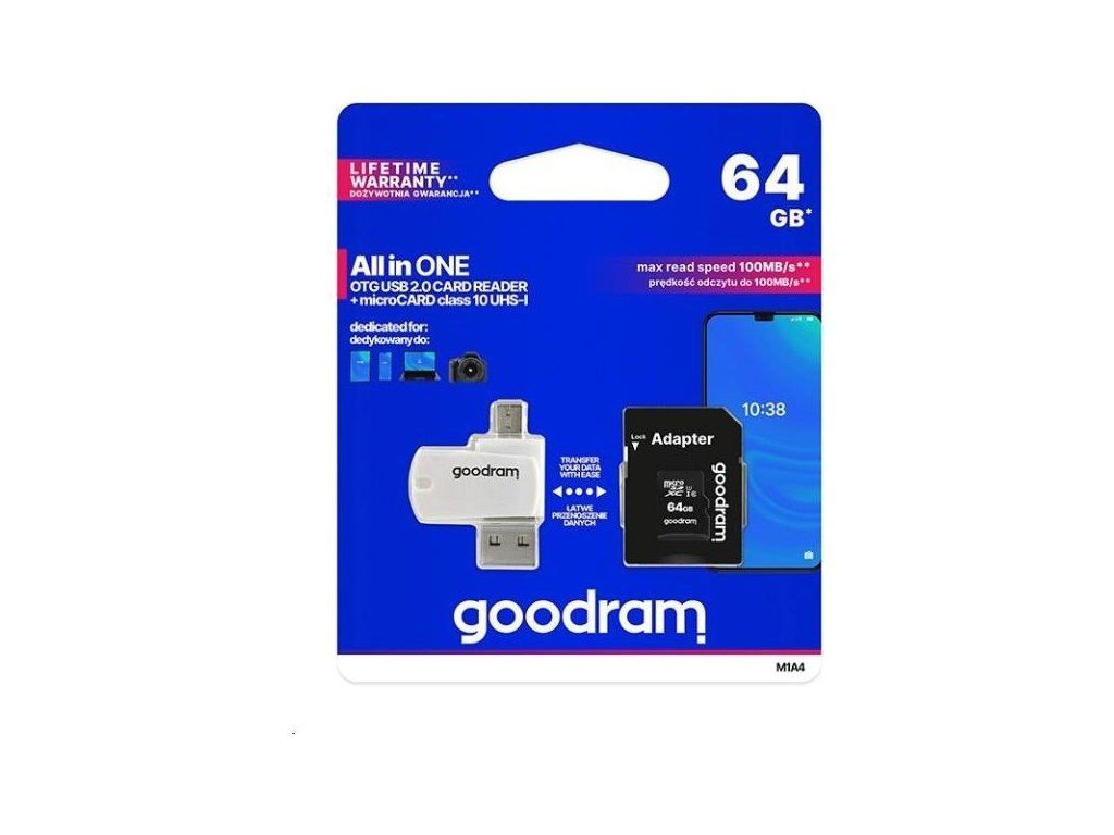 GOODRAM M1A4 All in One poskytuje všestrannosť tým, že poskytuje funkčnosť viacerých zariadení v jednom riešení. Ide o čítačku kariet vybavenú konektormi USB 2.0 a micro USB, umožňujúcu jednoduchý prenos dát medzi počítačmi, smartphonmi, tablety a fotoaparátmi. Dodáva sa s rýchlou UHS-I microSD kartou.