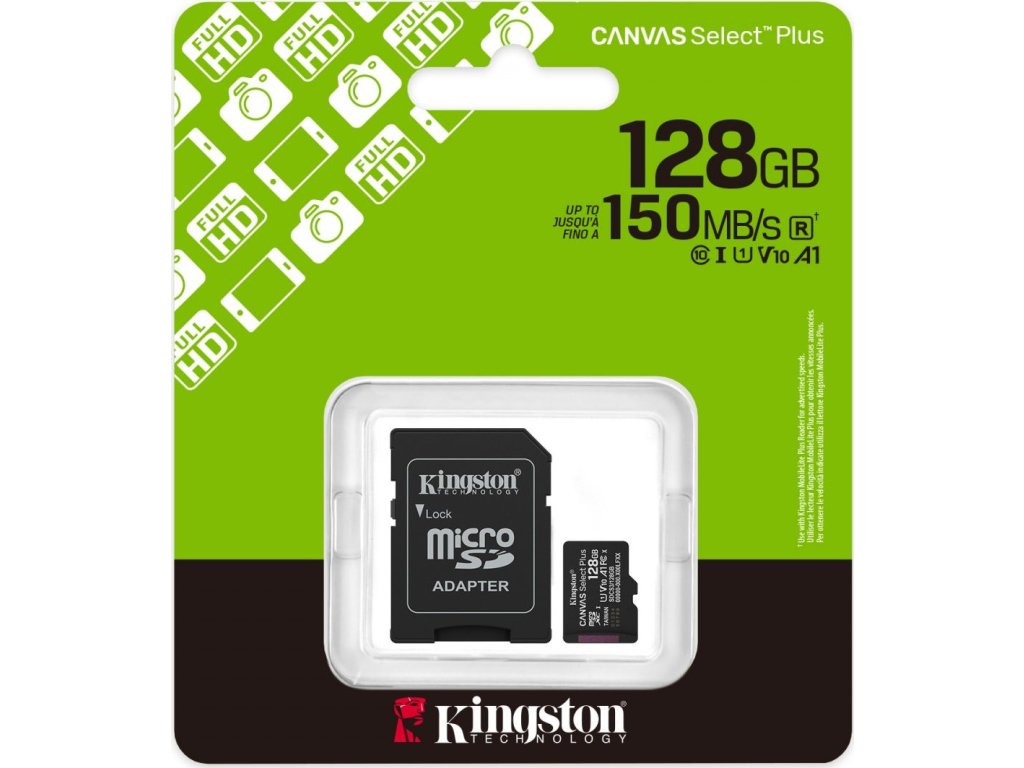 Karta microSD Canvas Select Plus od spoločnosti Kingston ponúka spoľahlivý výkon, je kompatibilná so zariadeniami so systémom Android a fotoaparátmi a dosahuje rýchlosť až 150 MB/s. Vďaka výkonu aplikácií A1 zabezpečuje plynulý multitasking a rýchle načítanie. Je odolná a všestranná, takže je ideálna pre každodenné potreby úložiska.