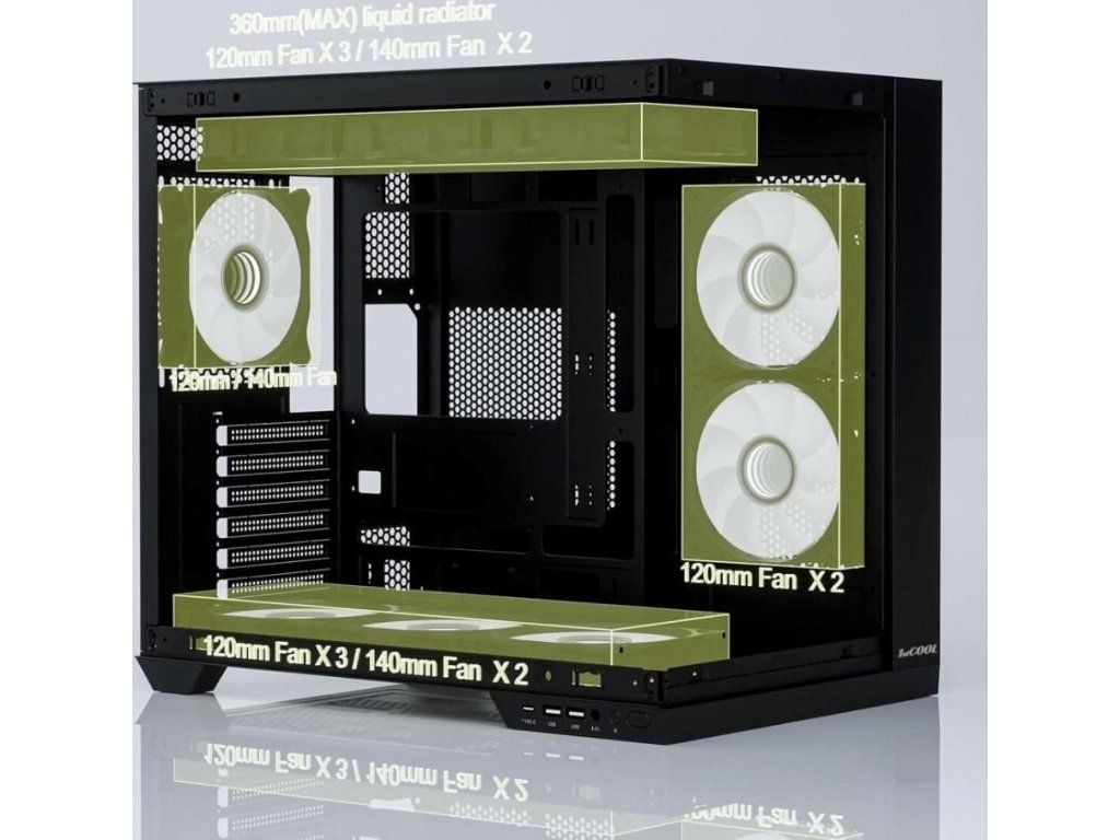 Napriek kompaktným rozmerom ponúka priestor až pre 400mm dlhé grafické karty, 176mm vysoké chladiče a vodné chladenie až do veľkosti 360 mm. Uvnitr nájdeš bohaté možnosti osadenia ventilátorov (až 9 kusov 120/140 mm), môžeš si vybrať z viacerých variantov 1stCOOL ventilátorov vrátane aRGB riešení, prípadne doplniť aj aRGB držiak grafickej karty.
