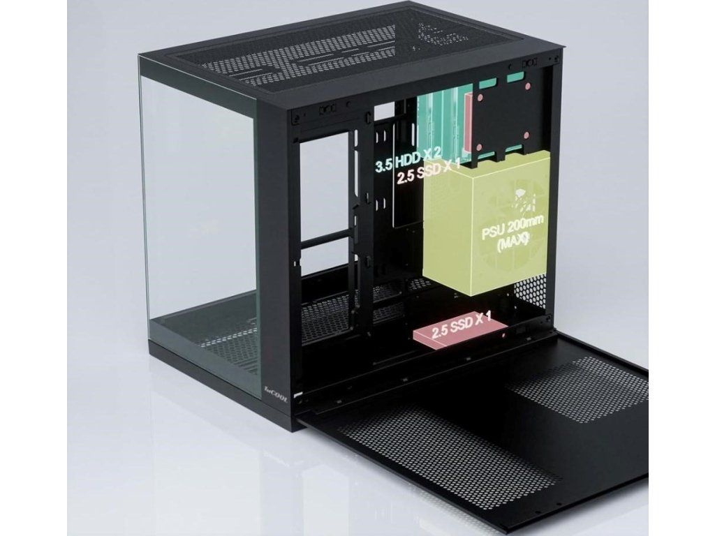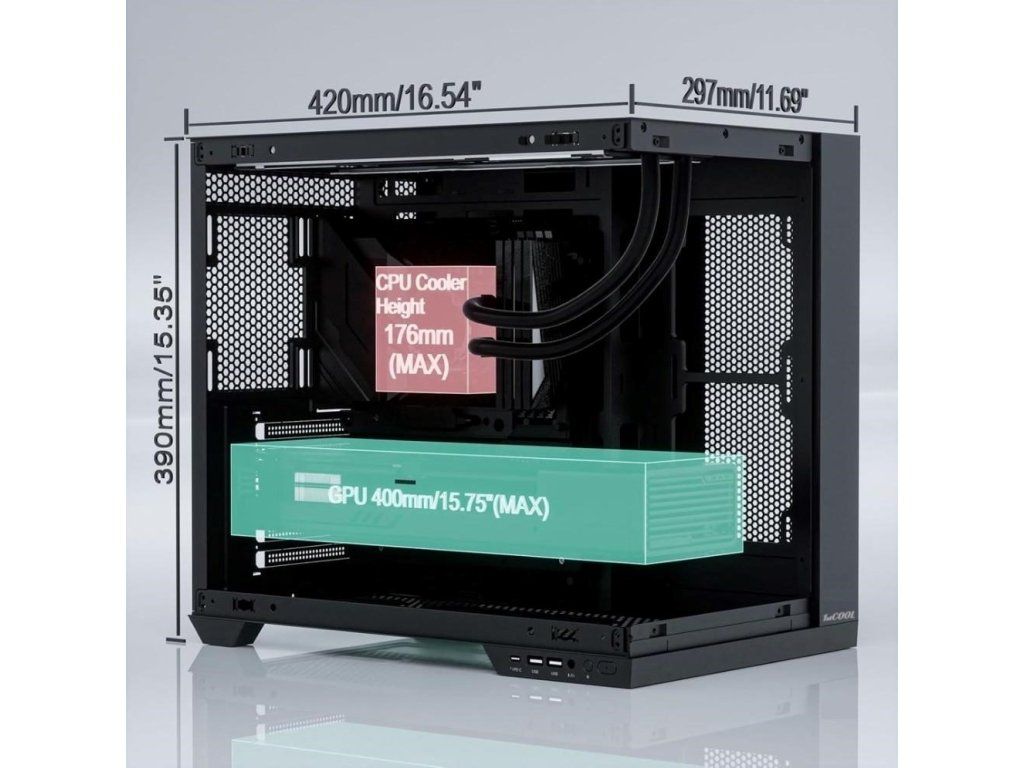 Navzdory kompaktným rozmerom ponúka priestor až pre 400mm dlhé grafické karty, 176mm vysoké chladiče a vodné chladenie až do veľkosti 360 mm. Vo vnútri nájdeš bohaté možnosti osadenia ventilátorov (až 9 kusov 120/140 mm), vyberať môžeš z niekoľkých variantov 1stCOOL ventilátorov vrátane aRGB riešenia, prípadne doplniť aj aRGB držiak grafickej karty.