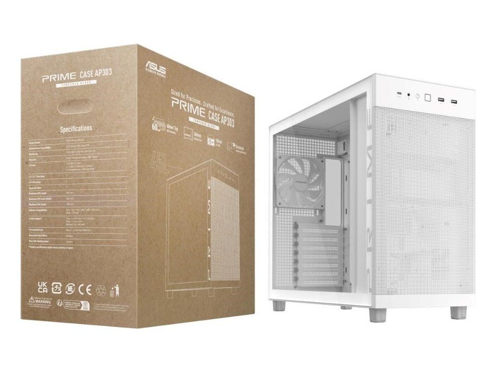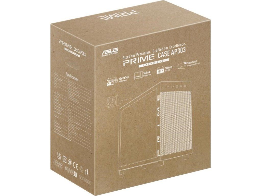 ASUS Prime AP303 je kompaktná ATX skrinka s objemom 44 litrov, ktorá podporuje grafické karty až do dĺžky 360 mm, radiátory až 360 mm a hrúbky do 60 mm a ATX zdroje do dĺžky až 180 mm.