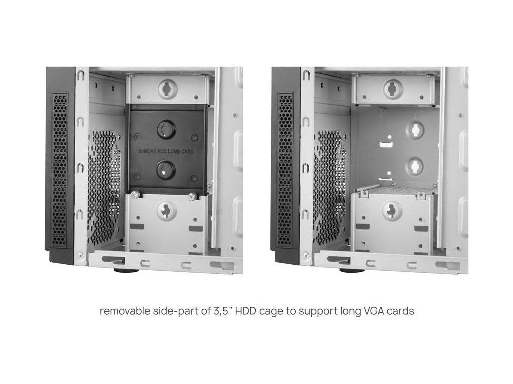 | Interná priehradka na disk | 5x 3,5" alebo 4x 3,5" a 1x 2,5" bez bočnej časti 3,5" klietky na HDD na podporu dlhých kariet VGA možné 3x 3,5" alebo 2x 3,5" a 1x 2,5" |