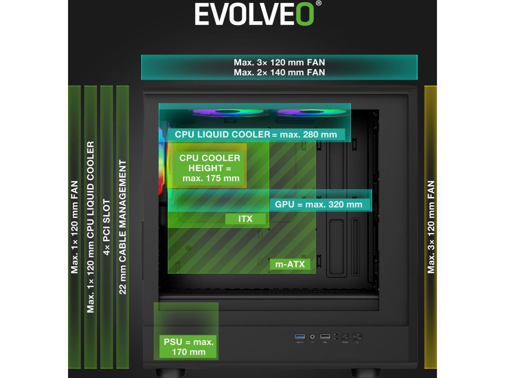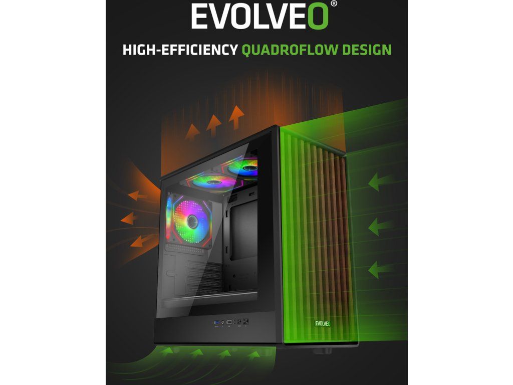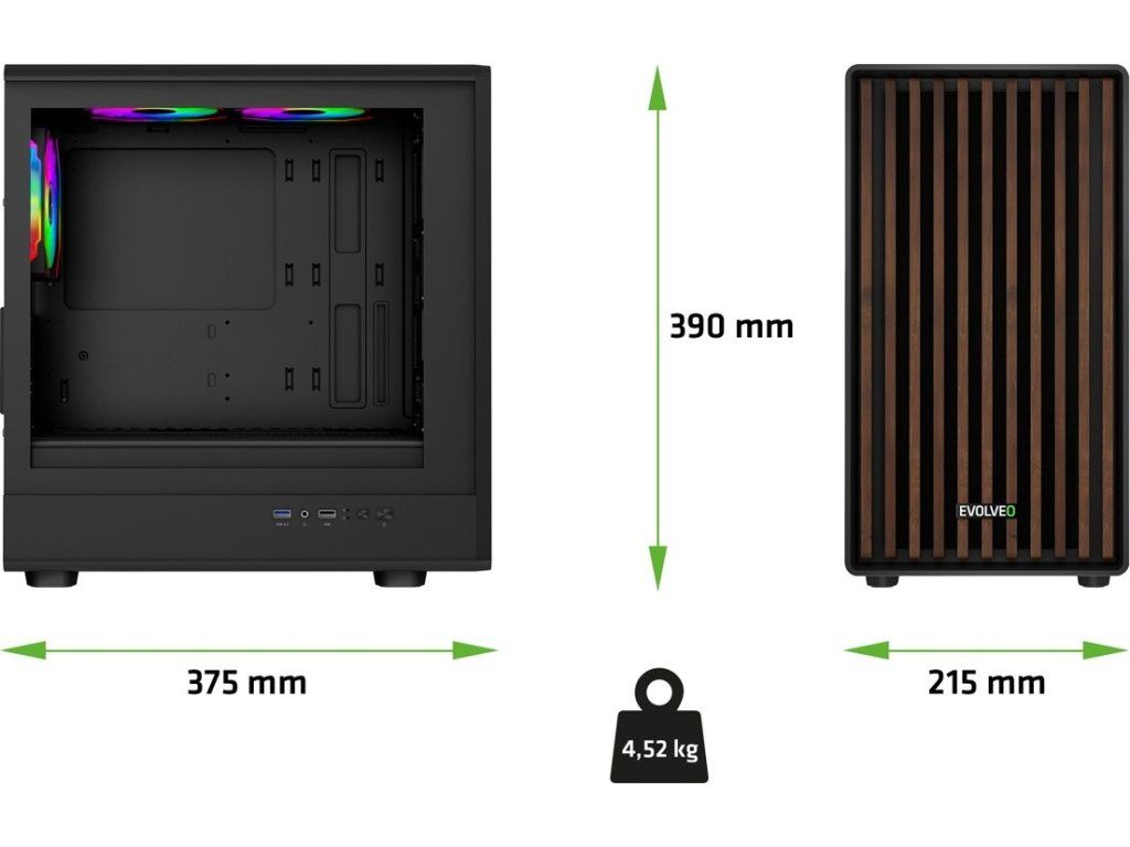 EVOLVEO Panthera, skříň mATX, 3x ARGB ventilátor 120mm, dřevěný přední panel + skleněná bočnice